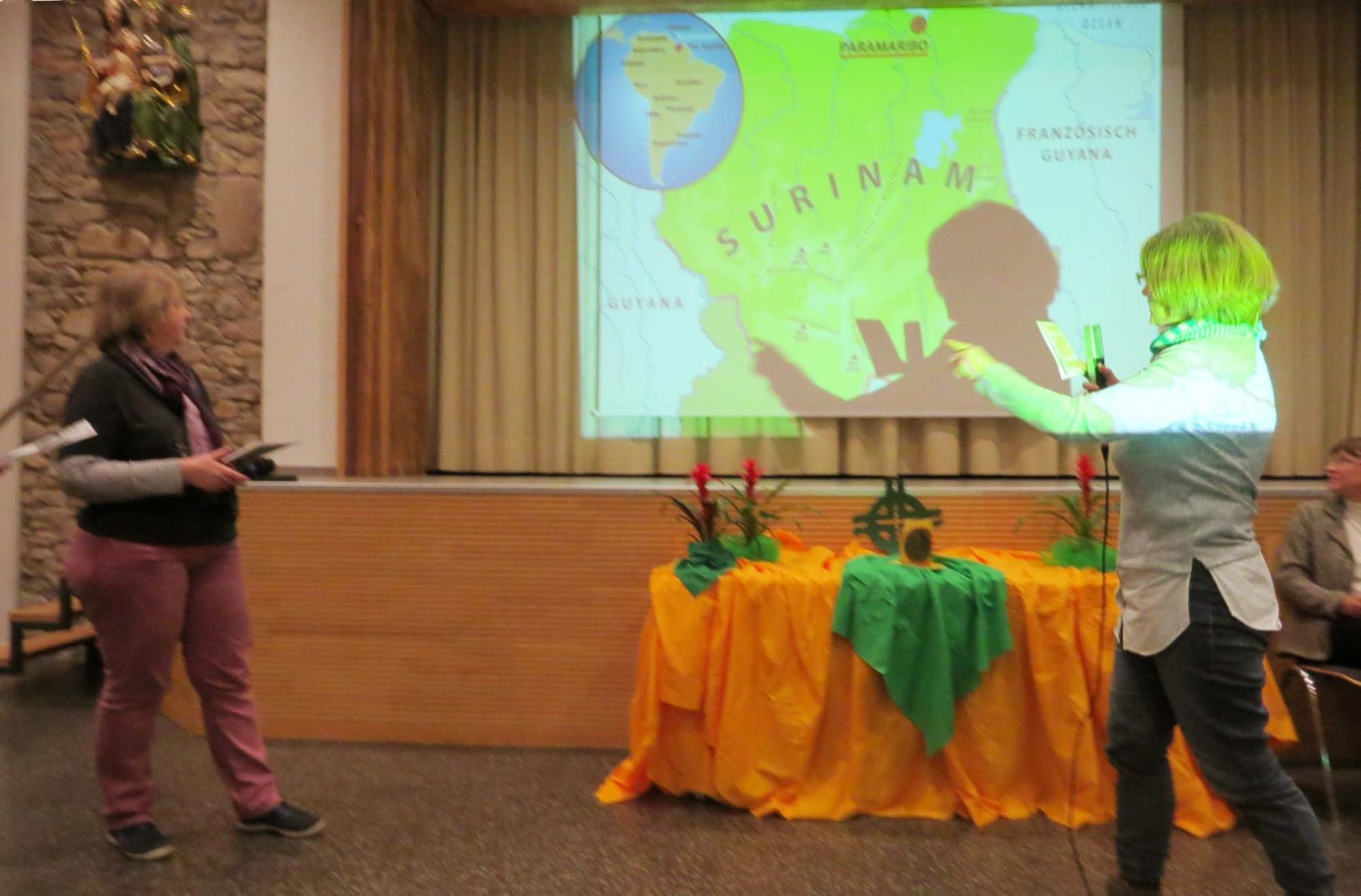 »Surinam? Davon haben wir noch nie gehört«, wunderten sich die Frauen des Organisationsteams zu Beginn des Gottesdienstes. Darum gab es gleich zu Beginn viel Information zu dem Land, das auf einer großen Landkarte auf der Leinwand gezeigt wurde. Surinam ist das kleinste Land Südamerikas, nur knapp so groß wie Deutschland mit gerade einmal 550.000 Einwohnern. Es liegt geografisch nördlich von Brasilien und besteht zu 90 Prozent aus tropischem Regenwald. Knapp 50 Prozent der Bevölkerung sind Christen. Darüber hinaus gibt es große Gemeinschaften aus Java, Hindus, afrikanische und indigene Naturreligionen und Juden.
