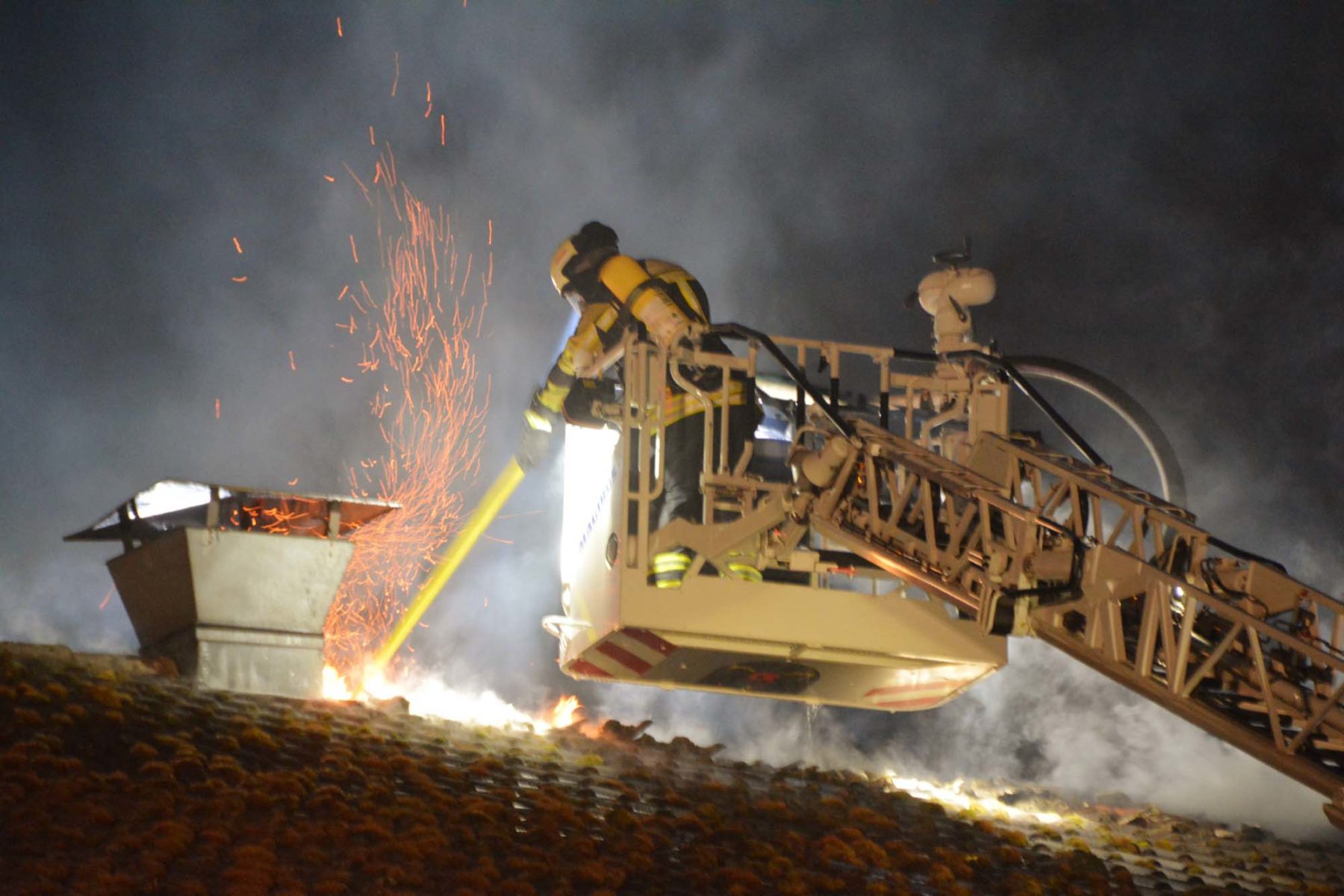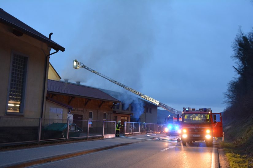 Da die Feuerwehr von innerhalb der Halle keinen Zugriff auf das Feuer hatte, bestand die Gefahr, dass die Dachhaut durchbrennt und sich das Feuer auf den ganzen Dachstuhl ausbreitet. Deshalb wurde die Dachhaut von der Drehleiter aus geöffnet und das Feuer von außen gelöscht. Teilweise war die Dachhaut bereits durchgebrannt.
