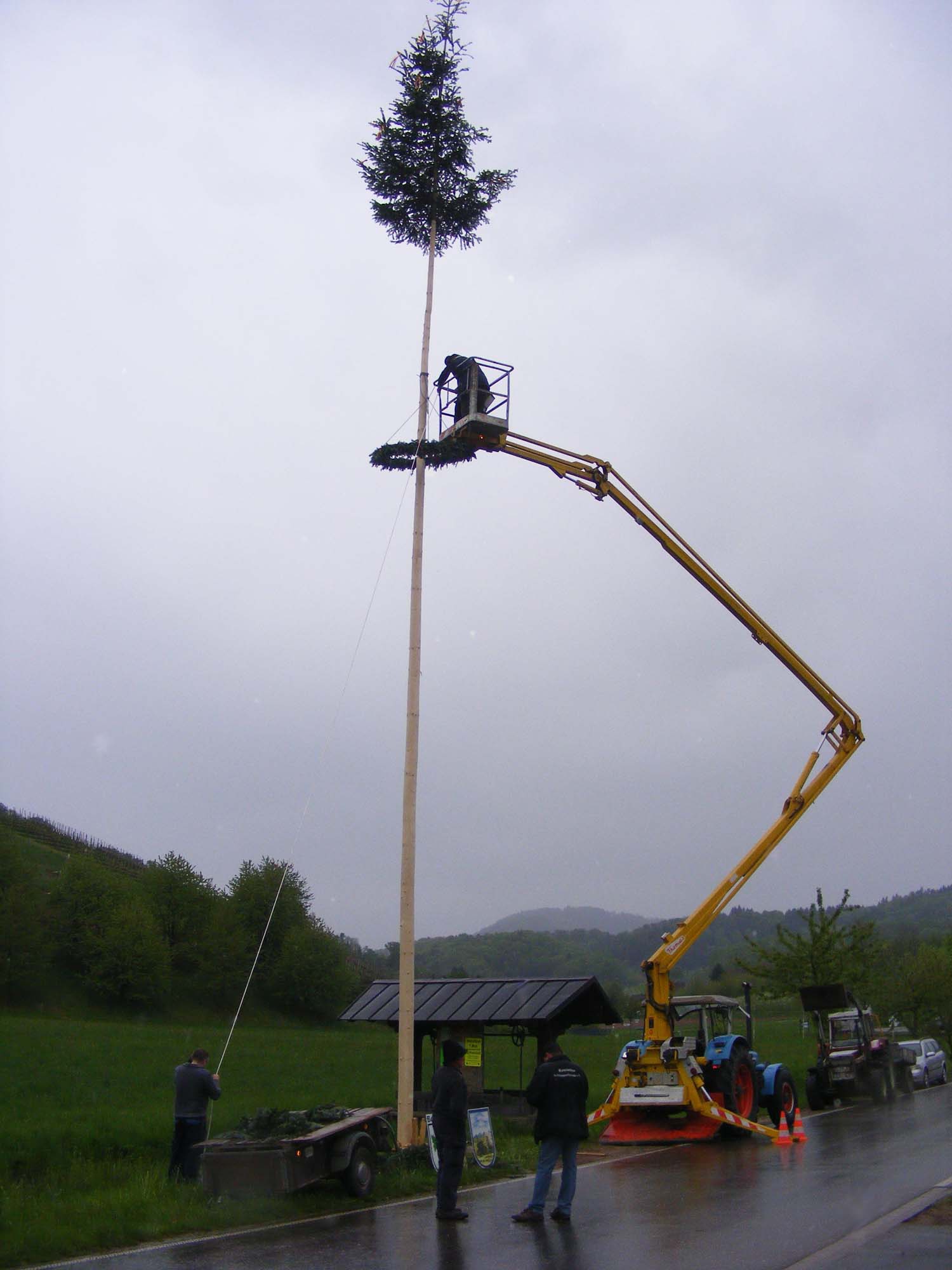 Man schreibt den 30. April, 8.30 Uhr. Drei Schlepper mit Seilwinden und Frontlader, dazu zehn Vereinsmitglieder haben sich beim Festplatz eingefunden. Mit kurzen Worten gibt Vorstand Sepp Brandstetter den Standort des Baumes bekannt. Zwei Schlepper mit Einachsanhänger wären für diesen Einsatz ausreichend. Der dritte Schlepper dient der Sicherheit, denn es sind schwierige Manöver zu erwarten. Auf dem ersten Anhänger ist eine Holzkonstruktion mit Mulde zur Aufnahme des Maibaumstammes montiert. Man stelle sich einen robusten Holzbock mit Drehschemel vor. Der zweite Anhänger übernimmt das Arbeitsgeschirr. Das sind Kettensägen, Spannketten, Wendehaken, Gurtelemente und eine Umlenkrolle für schwierige Rückemanöver. Die Baumfäller machen sich auf den Weg. Am Einsatzort wird der Baum vorgestellt und die Vorgehensweise besprochen. Der Maibaum sollte möglichst schonend gefällt und transportiert werden. Zwei Schlepper kommen zum Einsatz. Ein roter Güldner Baujahr 1964 mit Ritter-Dreipunktwinde zieht per Seil am Stamm, um den Baum zu Fall zu bringen. Um den Baum beim Fällen nicht übermäßig zu strapazieren, wird der Fall über die Winde eines Steyr-Schleppers aus der Gegenrichtung gebremst. Der Güldner zieht, der Steyr lässt das Seil dosiert von der Winde. Minuten später setzt Vereinsvorstand Brandstetter die Kettensäge an, um den Fallkeil anzubringen. Die Äste im unteren Bereich mildern den Aufprall, so dass Krone und Stamm vom Schlimmsten verschont bleiben. Bagatellschäden werden erst beim Entasten sichtbar. Flinke Hände befreien den Stamm von seinem Astwerk. Zurück bleibt die Krone. Das Zierreisig wird zur Familie Busam nach Hause verbracht, um dort von einer weiteren Gruppe zu einem Kranz gebunden zu werden. Zwischenzeitlich ist man im Wald damit beschäftigt den Maibaum auf den Abfuhrweg vorzuliefern. Die Problematik besteht darin, die ausladende Krone zwischen den Bäumen hindurchzujonglieren. Zugseile werden über hoch positionierte Umlenkrollen geführt, um den Baum während der Manöver möglichst vom Boden anzuheben. Mit der Verladung des Baumes ist eine weitere Hürde des kräftezehrenden Tagwerks genommen.