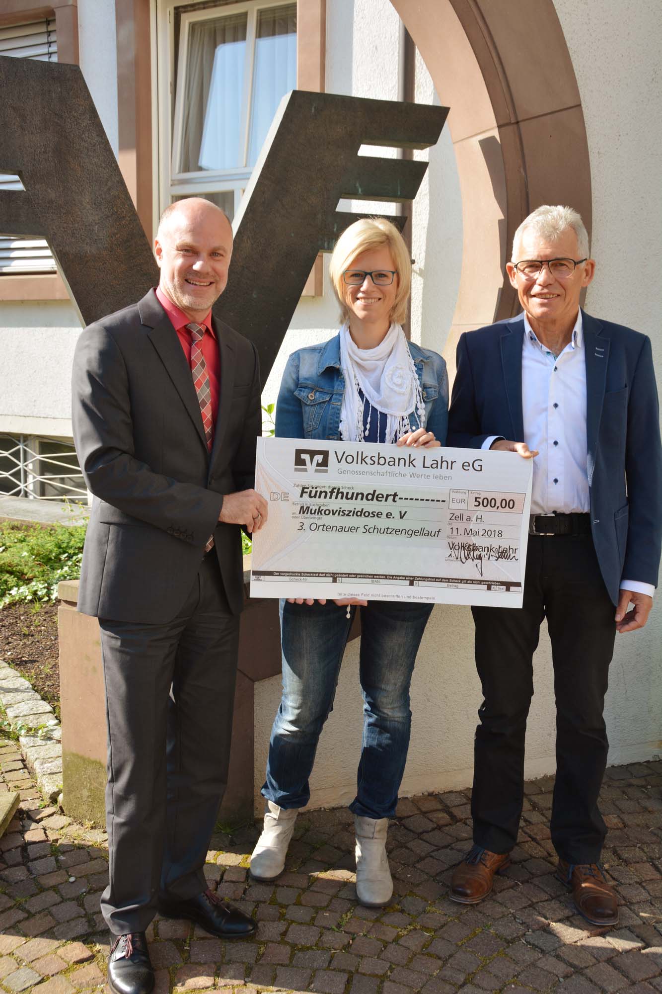 Die Volksbank Lahr unterstützt den 3. Ortenauer Schutz­engellauf mit einer Spende in Höhe von 500 Euro. »Eine tolle Aktion«, lobte Geschäftsstellenleiter Mathias Hug und lobte den großen Einsatz, den Willi Kohler und Silke Bildstein im Vorfeld des Spendenlaufs erbringen. Die Volksbank Lahr wird mit einigen Teilnehmern als Firmenmannschaft am 26. Mai mit an den Start gehen.