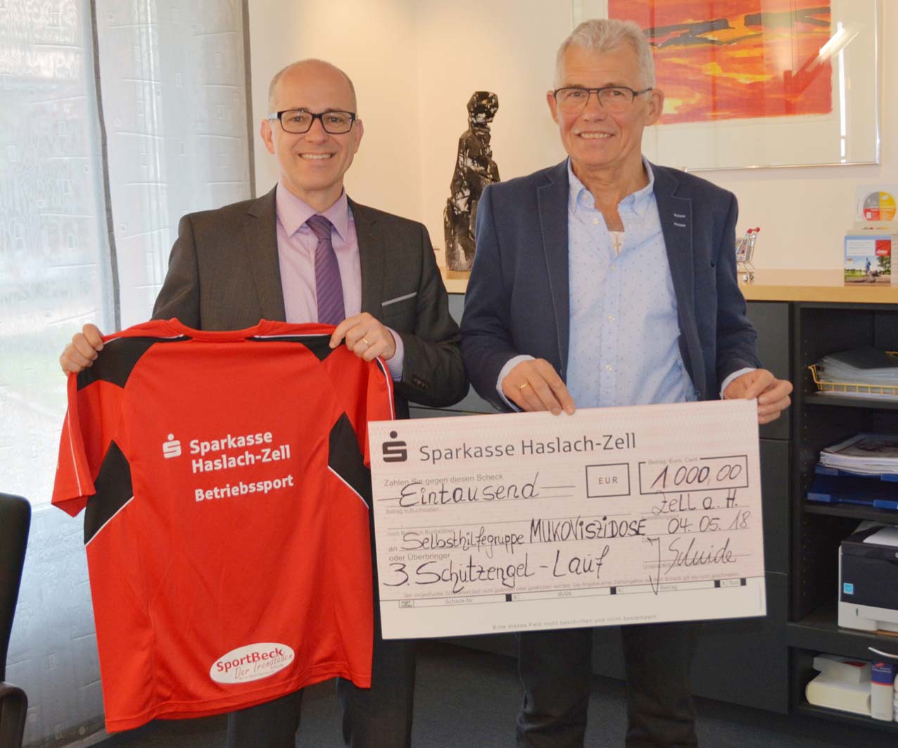 Sowohl die Sparkasse Haslach-Zell als auch die Volksbank Lahr unterstützen den Spendenlauf. Sie übergaben ihre Spenden und haben angekündigt, dass sie auch mit Firmenmannschaften aktiv am Lauf teilnehmen.