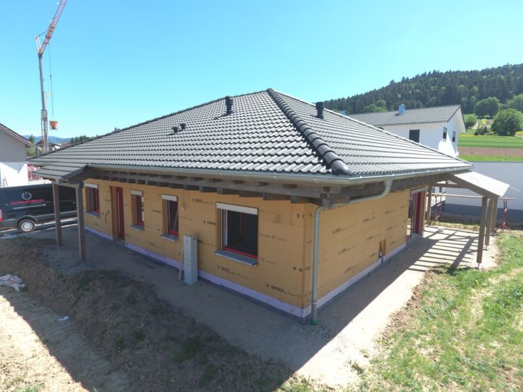 trockenen Fußes das Haus umrunden kann. Außerdem werden eine überdachte Terrasse und ein Carport errichtet. Für die benötigte Heizenergie sorgt eine Luft-Wärme-Pumpe.
