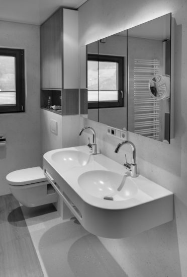 Generell gilt im Schlauchbad: Viel Licht hilft auch viel. Die Beleuchtung der seitlichen Wände gibt dem Raum Breite. Spiegelflächen können diesen Effekt sogar noch unterstützen, da die Vervielfältigung des Raumes nach rechts und links Größe suggeriert, wo gar keine ist. Generell gilt in zu langen Räumen: Bodenmaterial sollten Sie gegen die lange Richtung verlegen, damit der Schlauch nicht zusätzlich betont wird.