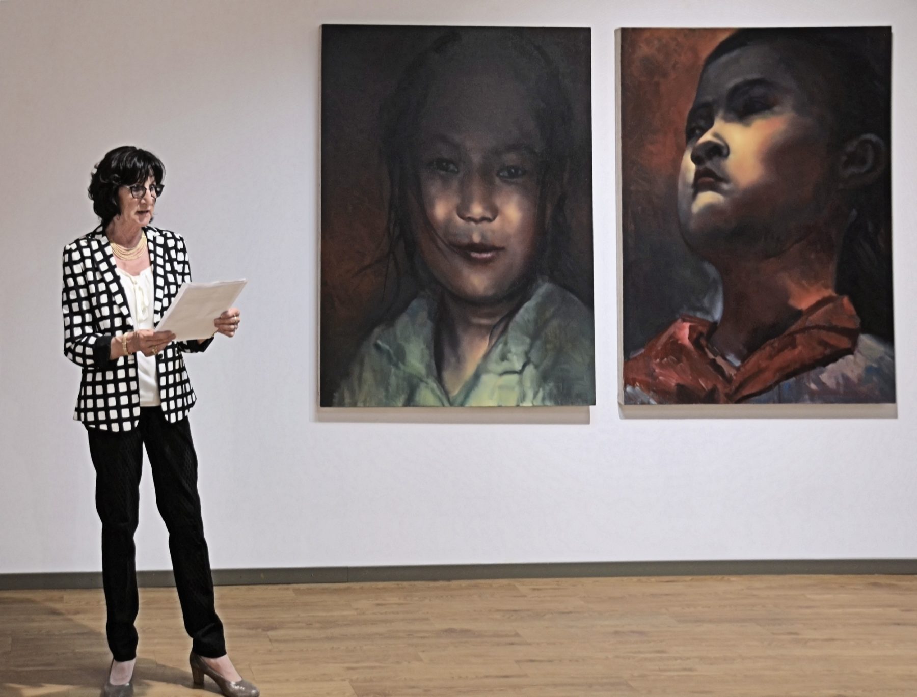 Foto: Gerhard VaternahmNach der Gästebegrüßung stimmt Dr. Uta Klein-Bischoff in Vertretung ihres Mannes Walter Bischoff in das Thema der beiden Künstler ein. In die seit fast drei Jahrzehnten andauernden historischen und gesellschaftlichen Veränderungen. He Jinwei und sein Weggefährte Zhang Jie sind Namen, die sich schon von Ausstellungen und Messepräsenzen der Walter Bischoff Galerie eingeprägt und unter Sammlern und Kunstinteressierten einen hohen Stellenwert haben. Sowohl der ältere Zhang Jie als auch der jüngere He Jinwei beleuchten intensiv das Verhältnis von Geschichte und Gegenwart und dessen Auswirkungen auf die menschliche Gesellschaft in ihrem Heimatland. Sie gehen in ihren Arbeiten (Öl auf Leinwand) der Frage nach, inwieweit das Gestern das Heute beeinflusst, was Bestand hat und wie sich die Zukunft ihres Landes gestalten wird. In ihren teils wandfüllenden, teils kleinformatigen Arbeiten, schaffen sie unvergängliche Momentaufnahmen.