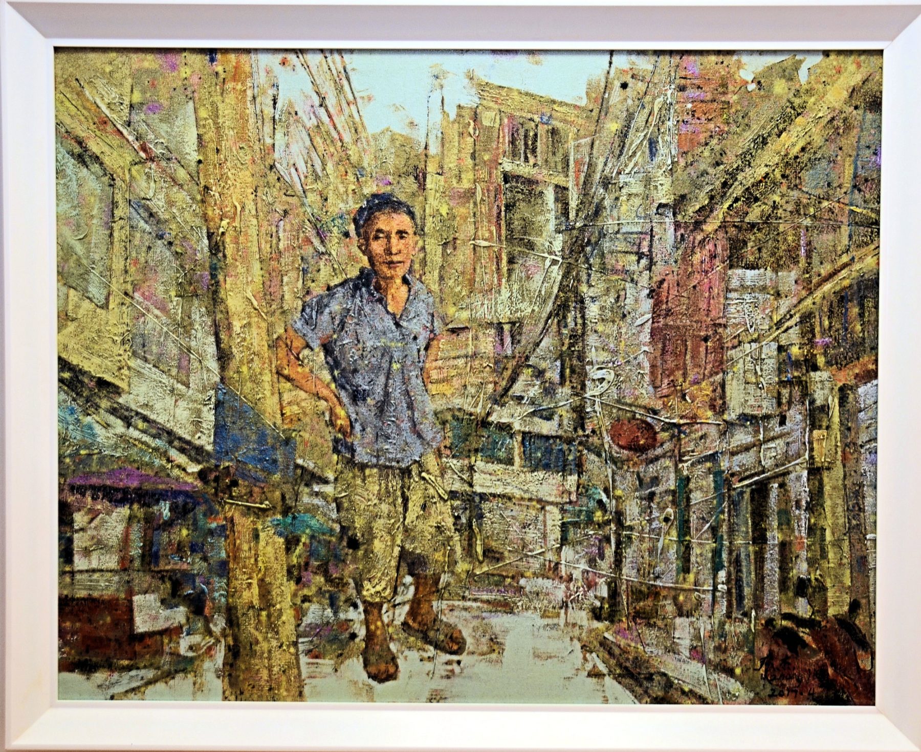 Orte, oftmals weit abgelegen von Ballungszentren, bilden die ärmliche Kulisse, die Jinwei aus seiner eigenen Kindheit noch kennt. Traurig-triste graue Hinterhöfe, deren Bewohner ebenso grau, traurig und verlassen wirken. Im Gegensatz zu Professor Zhang Jies Senioren sollten diese Kinder die Zukunftsträger sein – und sind doch schon umständehalber abgehängt, da niemand sie fördert und mit einbezieht in die gesellschaftlichen Veränderungen. Mit überdimensionierten fotorealistischen Kinderporträts, wie wir sie von anderen Ausstellungen He Jinweis gewohnt sind, macht der Künstler auf diese unzumutbaren Lebenssituationen aufmerksam. Er unterstreicht die Tragik dieser Persönlichkeiten mit schwermütigem Trauerschwarz und verschleiertem Nebelweiß.