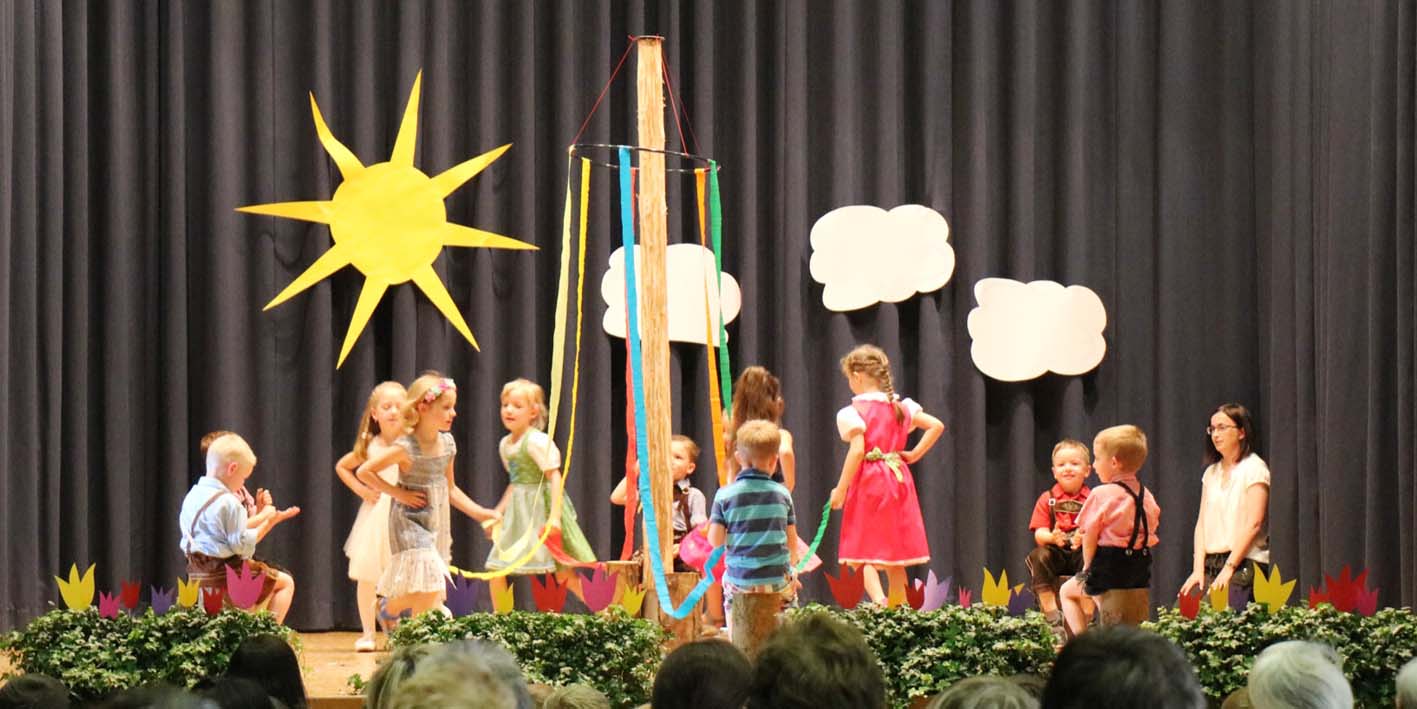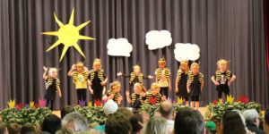 und sangen danach das Spiellied »Kleiner Käfer auf der Hand…«. Die Mäusefamilie spielten die Klanggeschichte »Frederick« und grüßten mit ihren Instrumenten den Frühling. Zum Lied der Biene Maja legten alle Bienen einen flotten Tanz hin und begeisterten das Publikum mit ihrer Energie. Das Spiellied der Frösche wurde durch den Chor der anderen Kinder unterstützt und der Abschluss des Programmes wurde von den Kindern durch einen peppigen Maibaum-Tanz abgerundet. Die Kinder mussten sogar noch eine Zugabe des Tanzes geben.
