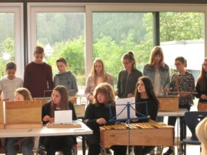 Nach dem Vorbild des Minimal Music-Pioniers Steve Reich haben die Neuntklässler und Rainer Lietzmann gemeinsam zwei Stücke komponiert und führten sie in der Mensa erstmals öffentlich auf: »Composition No. 1« entfaltete mit den Xylofonen und zusätzlich eingesetzten Bass-Stäben eine beachtliche Dynamik, während bei »Composition No. 2« das Spiel zweier Querflöten über dem rhythmischen Fundament der Xylofone besonders beeindruckte. Auch dafür gab es reichen Beifall.