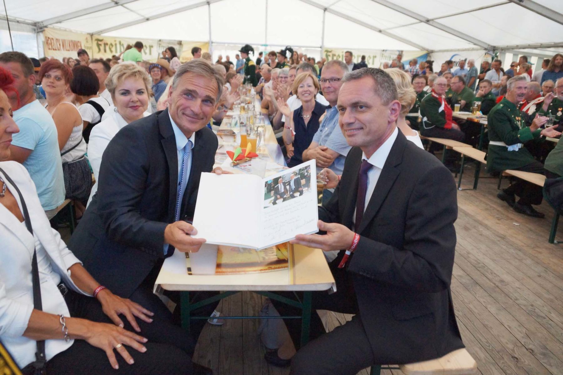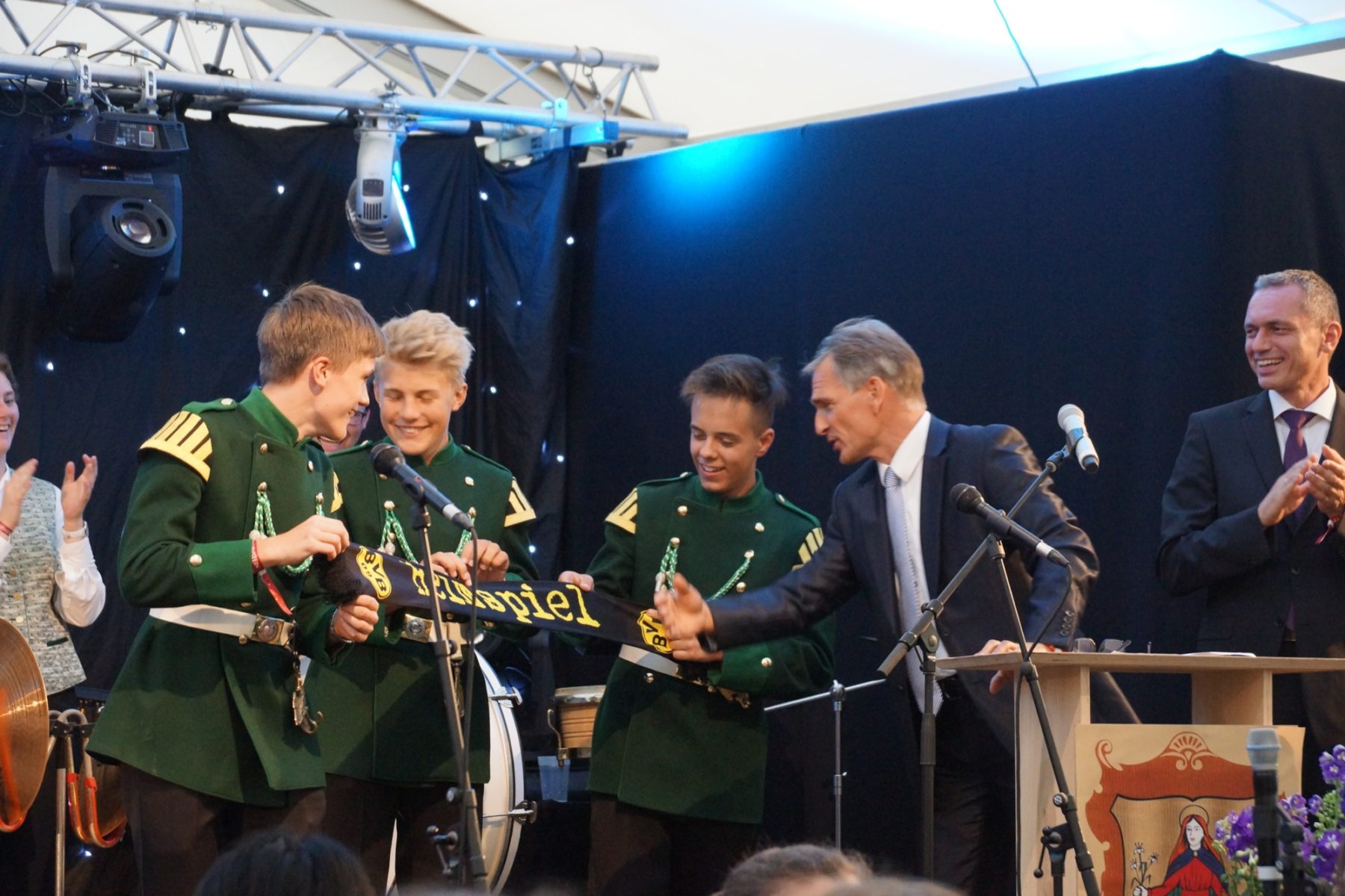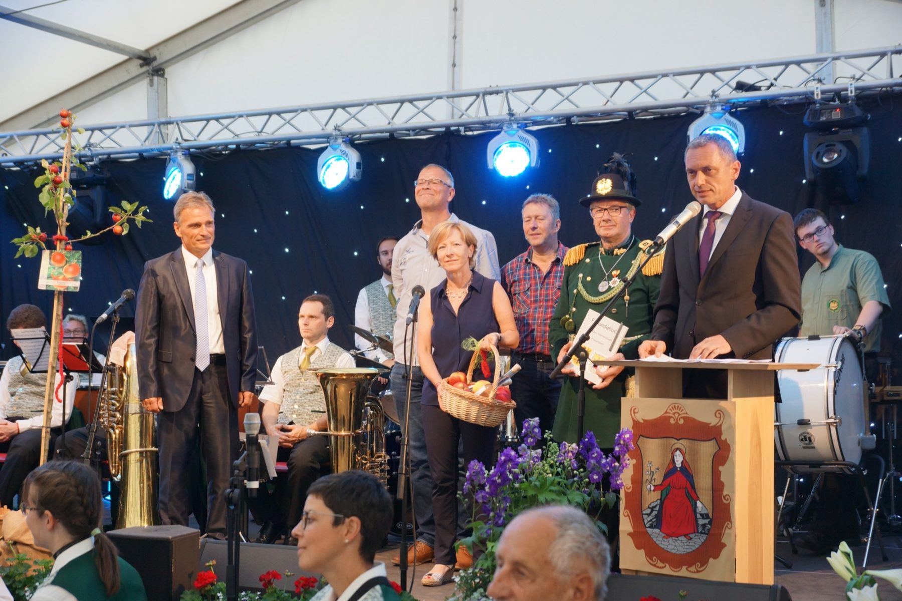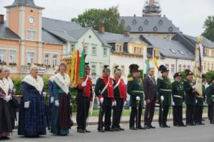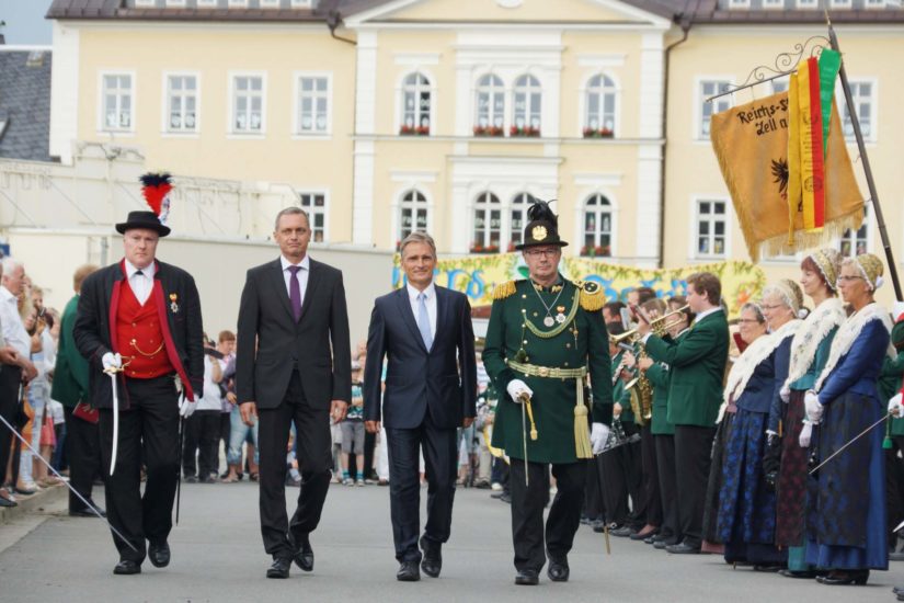 Am Samstag sorgte die Zeller Stadtkapelle mit schwungvollen Arrangements bereits zum Frühschoppen für gute Stimmung im großen Festzelt mitten auf dem Markplatz. Zu den Höhepunkten der Feierlichkeiten zählte außerdem der Sternenmarsch der Zeller und Unterharmersbacher Bürgerwehren gemeinsam mit den Frauensteiner Schützen unter Begleitung der Stadtkapelle. Zahlreiche Besucher verfolgten den Präsentiermarsch mit Salutschießen zum Auftakt des Jubiläums-Festaktes »800 Jahre Frauenstein« am Samstagabend. In ihrer Festrede ging Schirmherrin Veronika Bellmann, Mitglied des Bundestages, auf die bewegte Geschichte und die jüngsten Erfolge der Stadt ein und lobte ausdrücklich die gelebte Partnerschaft von Zell und Frauenstein. Gemeinsam mit Frauensteins Bürgermeister Reiner Hentschel hob sie zudem die besondere Bedeutung ehrenamtlichen Engagements für eine funktionierende Gemeinschaft gerade in kleineren Städten wie Frauenstein hervor, sicherlich eine wichtige Gemeinsamkeit mit der Partnerstadt Zell. Und auch wenn Reiner Hentschel in seiner Ansprache betonte, dass der Besuch der Zeller und die aktive Mitgestaltung des Festprogramms durch Musik und Bürgerwehr Jubiläums-Geschenk genug ist, kamen die Zeller natürlich nicht mit leeren Händen. Zells Bürgermeister Günter Pfundstein überreichte gemeinsam mit den mitgereisten Stadträten symbolisch für die feste Verwurzelung der Partnerstädte einen Apfelbaum und verband das Geschenk mit dem Wunsch, dass die Partnerschaft auch zukünftig wachsen und Früchte tragen möge. Dazu gab es einen Geschenkekorb mit allerlei Köstlichkeiten und eine Laterne, graviert mit den jeweiligen Stadtwappen von Zell und Frauenstein. Schließlich wurde ein Freundebuch überreicht, welches die vielen gewachsenen und an diesem Wochenende auch neu geknüpften persönlichen Freundschaften dokumentieren soll. Nach dem offiziellen Festakt wurde noch lange im Festzelt (oder für die Jugend bei der »Electronix« Open-Air-Schlossparty) gemeinsam gefeiert.