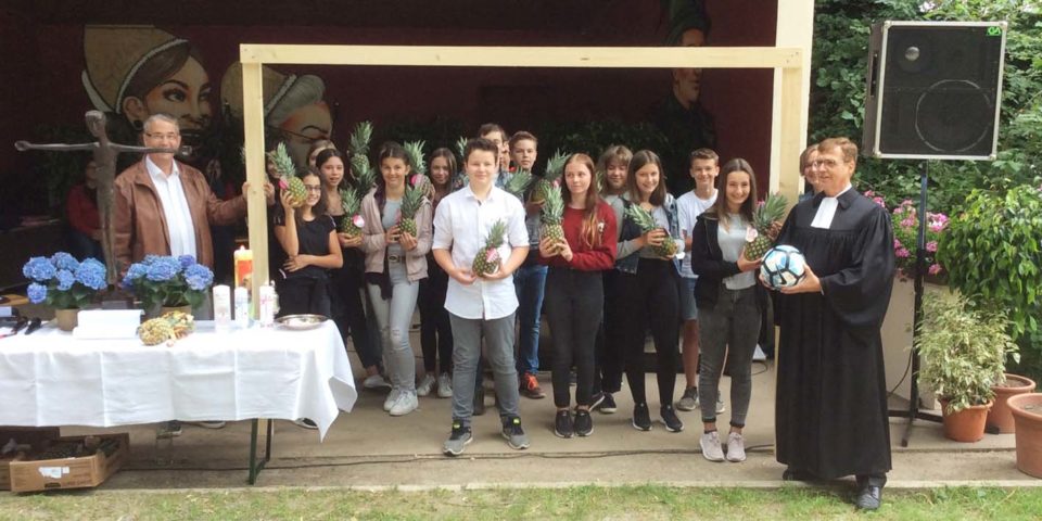 Im Mittelpunkt standen die Apostelworte: »Lauft so, dass ihr den Siegespreis erlangt«. Das Christenleben, so Pfarrer Monninger, ist wie ein Stadionwettlauf bis zum Ziel und ein Fußballspiel dem Tor entgegen. Dabei ist Fairness und Teamgeist gefragt. Die neuen Konfirmanden wurden zu den Gottesdiensten herzlich eingeladen, bei denen das Christenleben und die Begegnung mit Gott trainiert werden. Natürlich wurden die Konfirmanden in den Gottesdienst einbezogen. Sie nannten ihre Hobbys, signierten den Konfirmandenball und stellten sich mit einer goldenen Ananas ins Tor, wo Pfarrer Monninger das »Spiel« anpfiff.