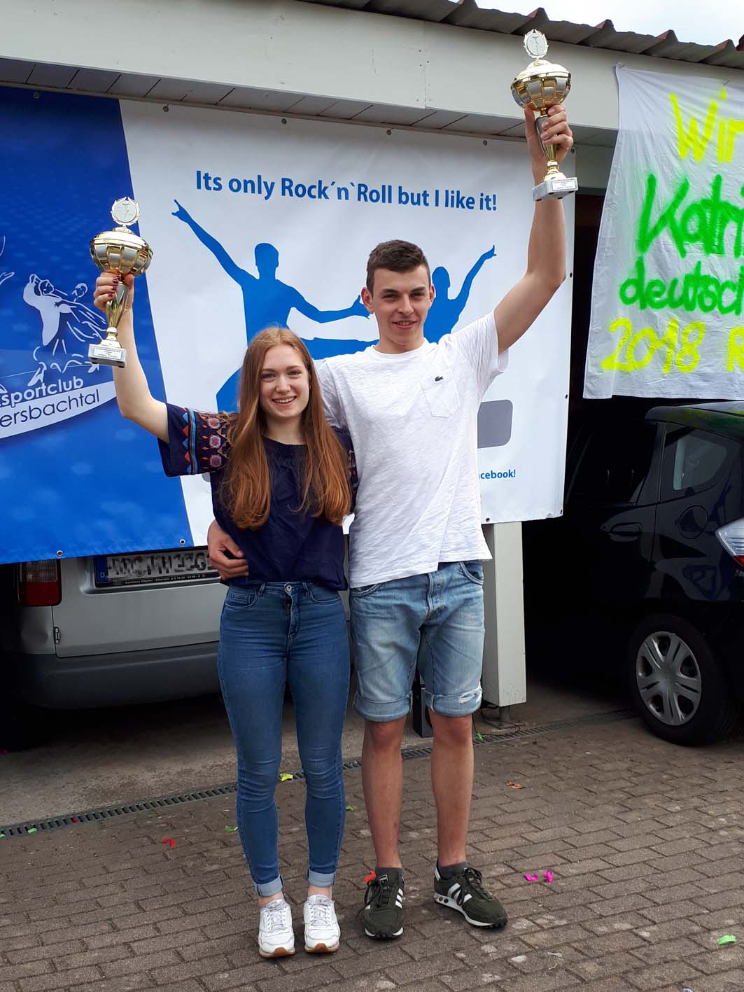 In der Vorrunde traten Katrin und Elias wie immer selbstsicher und stark auf und konnten sich mit sechseinhalb Punkten Vorsprung in die Endrunde katapultieren. In der Endrunde absolvierten Katrin und Elias ihr Programm sehr souverän und konnten sich mit ihren sauberen Akrobatiken den ersten Platz sichern. Als zweites Tanzpaar des Tanzsportclubs Harmersbachtal holten sie nach 26 Jahren wieder den Meistertitel nach Hause. Die Stimmung hätte nicht besser sein können. Endlich fiel alle Anspannung ab, auch bei den Mitgereisten. »Ich glaube, ich war fast noch aufgeregter als die beiden. Mir tat danach alles weh, fast als ob ich mitgetanzt hätte«, meinte eine Freundin. Doch das war noch nicht alles. Als sie am Sonntag Mittag zu Hause in Zell ankamen, warteten bereits viele Mitglieder des TSC auf sie und überraschten sie mit einer kleiner Feier. Sie hatten Banner aufgehängt und begrüßten die beiden mit großem Applaus und dem typischen dreifachen »Rock’n’Roll«-Ruf. So ein Erfolg musste natürlich gefeiert werden; schließlich kommt es nicht jeden Tag vor, dass ein Tanzpaar aus dem Heimatverein Deutscher Meister wird! Auch die beiden waren immer noch überwältigt. »Man hatte natürlich auf den ersten Platz spekuliert, aber wirklich zu hoffen gewagt hatte ich es nicht. Schließlich kann an dem Turnier selbst immer noch etwas passieren. Jetzt haben sich die elf Jahre Training und der viele Stress endlich ausgezahlt!«, meinte Katrin Pfundstein. Auch die Trainer sind sehr stolz auf sie. Aufhören wollen die beiden aber noch lange nicht. Nächstes Jahr wollen sie in der nächsthöheren Klasse, der B-Klasse tanzen. Schließlich braucht man immer neue Herausforderungen. Und wer weiß – vielleicht holen sie nochmal einen Meistertitel nach Hause.