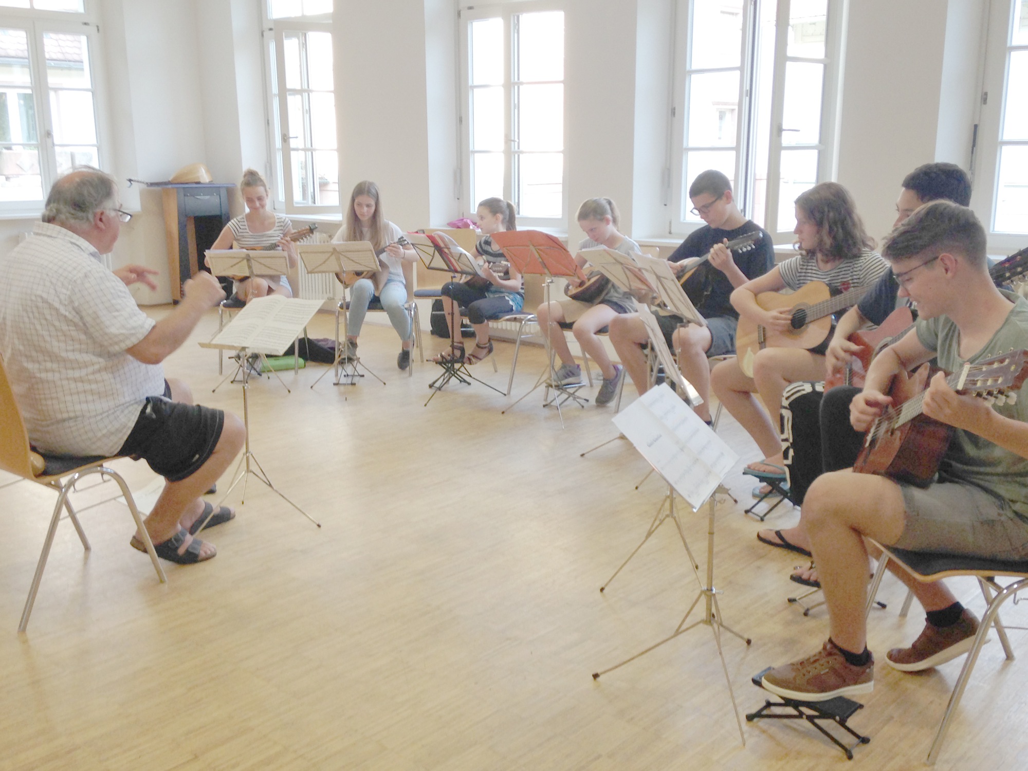 Ab 10 Uhr heißt es im Kunstzentrum der Karlskaserne »An die Saiten, fertig, los!«. Die Zeller Jugend – Durchschnittsalter 12 Jahre – ist um 12.30 Uhr dran. Einstudiert hat das Ensemble aus drei Gitarren und fünf Mandolinen mit ihrem Leiter Konrad Vollmer »Kolo Kalendara«, einen Tanz aus Jugoslawien, »Ein gut Danzerey« – das sind Themen um 1600 aus Polen, Schottland und England – sowie einen südamerikanischen Mambo.