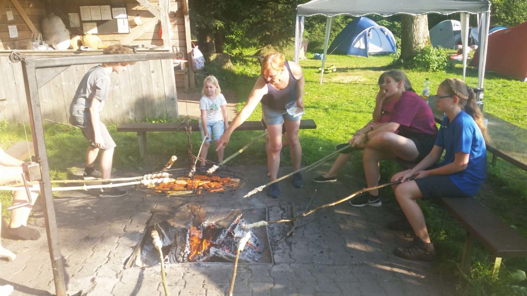 Bei Gegrilltem und Stockbrot macht so ein Trainingslager Spaß! Im Hintergrund das Zeltlager.