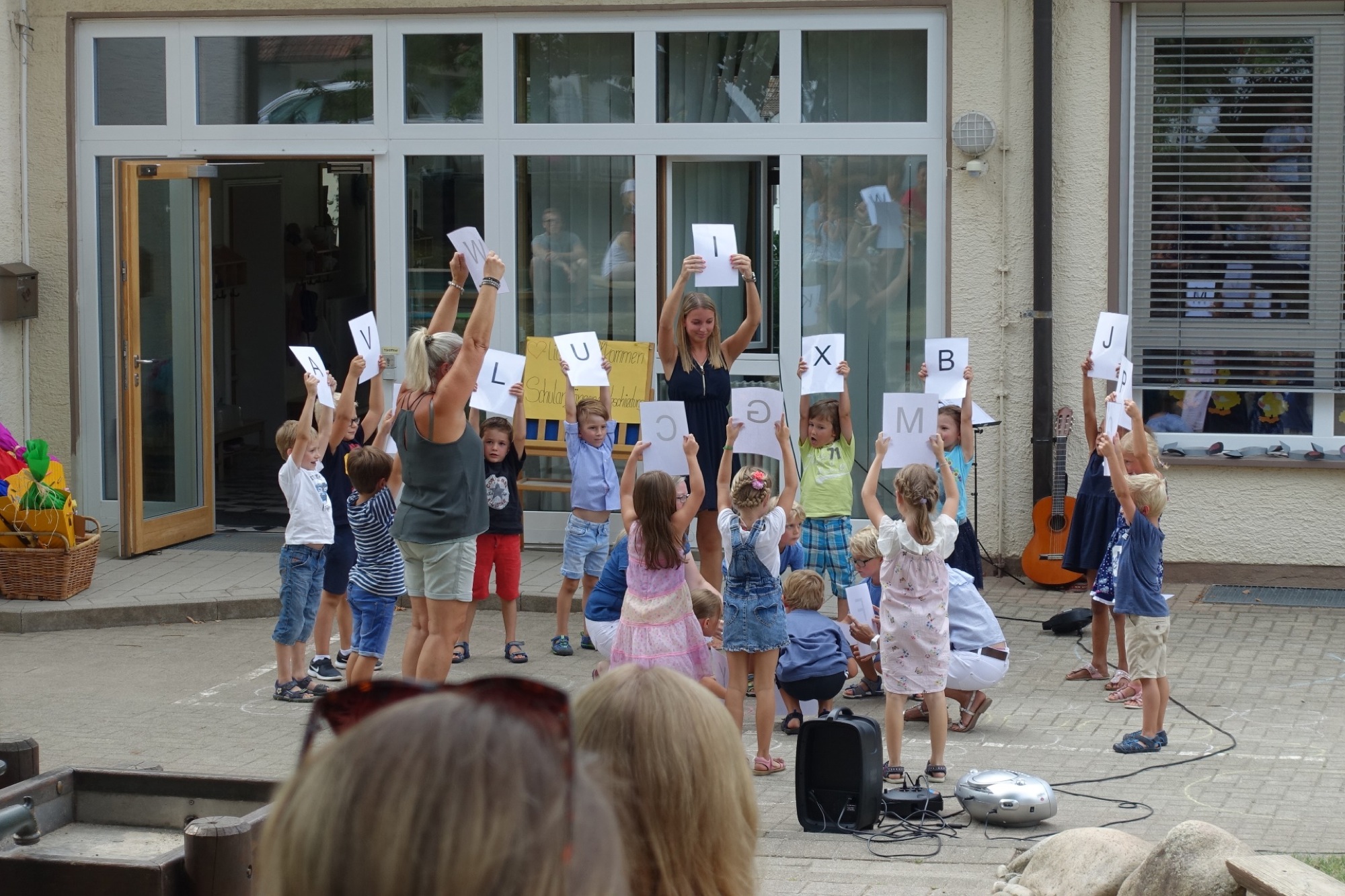»Alle Kinder lernen lesen« heißt es ab September für die Schulanfänger des Kindergartens Sternschnuppe. Mit einem fröhlichen Fest, bei dem die Familien der Kinder, die Elternbeiräte sowie die Kooperationslehrerinnen eingeladen waren, wurden die 18 Schulanfängerkinder verabschiedet. Die Krönung war die Übergabe der Schultüten, die den neuen Lebensabschnitt symbolisieren.