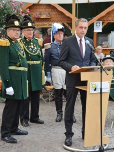 Heimat habe auch etwas mit Geschichte zu tun, lenkte Pfundstein den Blick auf die Bürgerwehr und die Stadtkapelle. Solche Rituale gelte es zu pflegen, denn all diese Erinnerungen würden sich letztlich zu einem Bild zusammenfügen, das zu einer Verbundenheit mit der Heimat und ihrer Geschichte führe. Der Bürgermeister dankte allen, die sich tagein und tagaus in die Gemeinschaft einbringen. »Dazu gehören sie alle, die heute hier auf dem Kanzleiplatz sind«, rief Bürgermeister Pfundstein den Akteuren und Gästen zu: »An so einem Tag dürfen sie sich deshalb selbst Beifall spenden!«