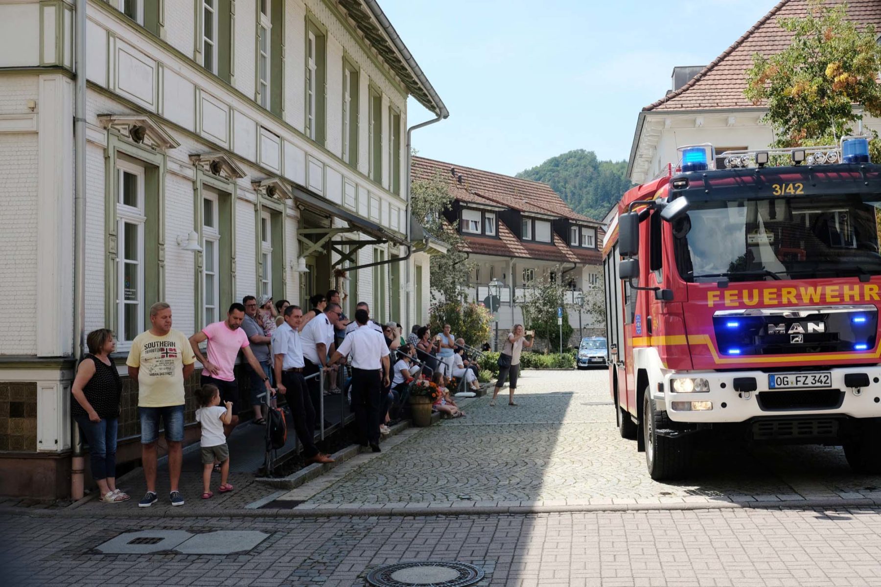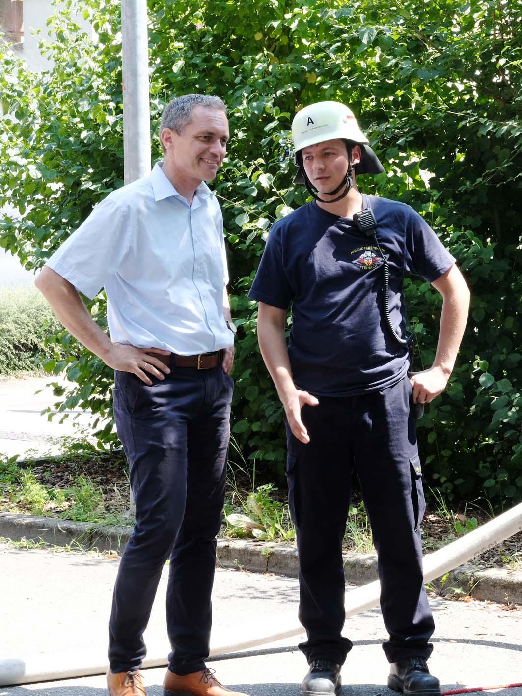 Als die Fahrzeuge eintrafen, warteten bereits zahlreiche Schaulustige vor dem »KUZ«. Trotz des Alters der Einsatzkräfte – die 40 Jugendlichen aus Zell und Steinach waren zwischen 10 und 16 Jahre alt – wirkten die nötigen Handgriffe routiniert. Zusammen mit den 15 »großen« Feuerwehrleuten wurde der Einsatzbereich abgesperrt, Pumpen aufgestellt, um die Wasserversorgung aus dem Bach aufzubauen, Schlauchleitungen verlegt und verletzte Personen aus dem Gebäude geborgen – alles als reines Übungsszenario natürlich und weniger mit Blick auf die benötigte Zeit als viel mehr mit sehr viel Erklärung und Hinblick auf die richtigen Abläufe. Mit dabei war auch der Zeller Bürgermeister Günter Pfundstein. Er hatte sich die Zeit genommen, um bei der Abschlussübung der 24-Stundenaktion persönlich dabei zu sein. Er zeigte sich beeindruckt, in welch großer Zahl der Feuerwehrnachwuchs bei bestem Sommerwetter die 24-Stundenaktion dem Schwimmbad vorzog, und führte Gespräche mit der ein oder anderen Nachwuchskraft. Als Dankeschön lud er im Namen der Stadt alle Teilnehmer nach der erfolgreich absolvierten Abschlussübung ins Eiscafé Venezia ein.