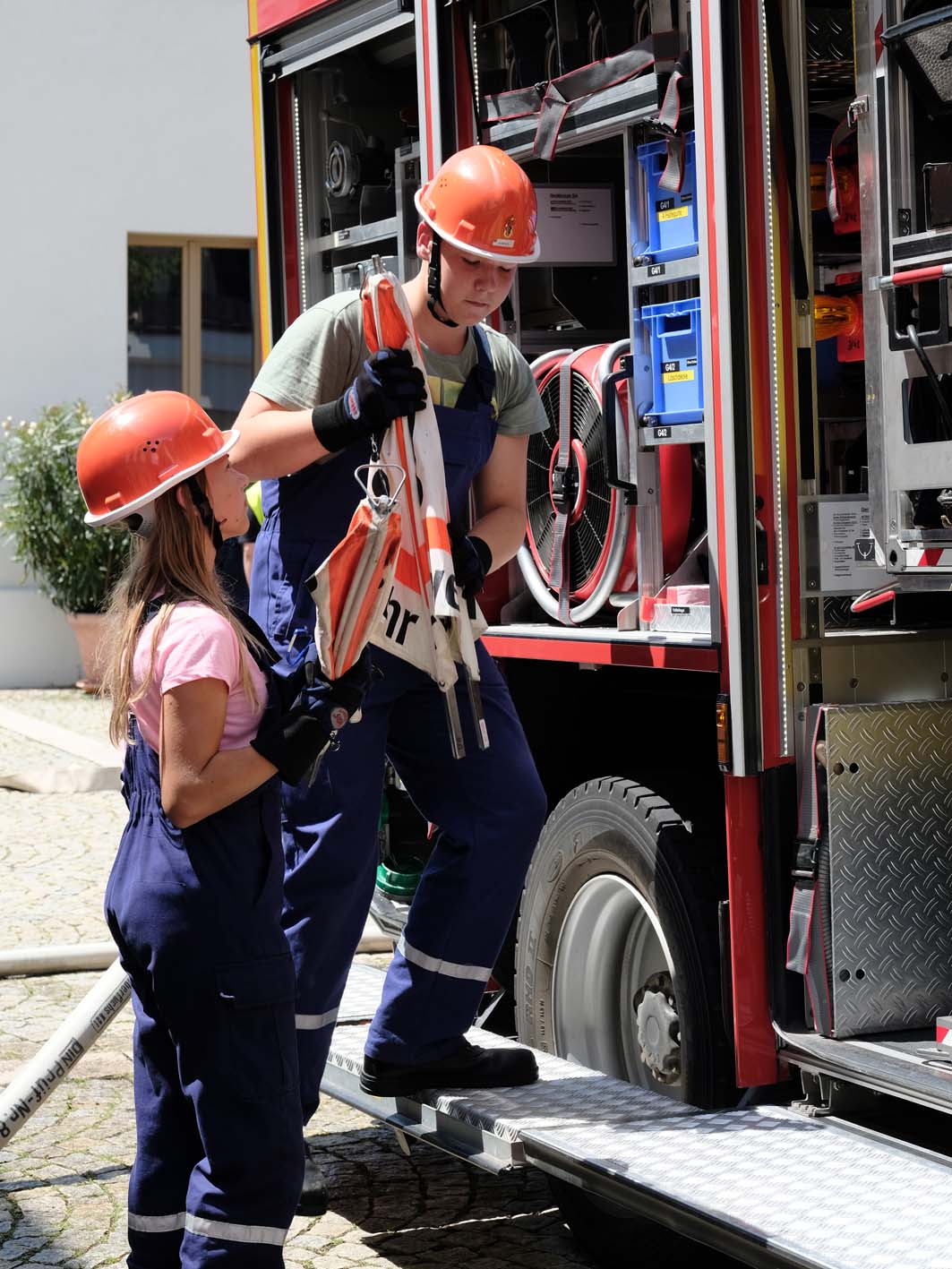 Um 7 Uhr am Samstagmorgen war das Frühstück angesetzt. Auch hier war besser beraten, wer nicht lange getrödelt und zügig seinen Morgenhunger gestillt hatte. Schon eine halbe Stunde später folgte nämlich der nächste Einsatz – Chlorgasalarm im Zeller Schwimmbad. In der Badeanstalt angekommen, erklärte Bademeister Wertwein, was es mit dem Chlor auf sich hat. Anschließend hatte die Jugendfeuerwehr die Becken ganz für sich alleine; vor der offiziellen Öffnung durften sie noch baden gehen, was den Nebeneffekt hatte, dass sogleich alle hellwach waren. Zurück im Gerätehaus wurde das Frühstück fortgesetzt und anschließend die Gerätschaften gepflegt. Was zunächst nach einem entspannten Samstagvormittag aussah, entwickelte sich schnell wieder zu einer Zeit, in der schnelles und umsichtiges Handeln gefordert war. Der nächste Alarm betraf die Rettung einer bewusstlosen Person aus einem unzugänglichen Spänesilo. Es gelang das Opfer mit einer Schaufelkorbtrage und Leitern wieder ins Freie zu befördern und so zu retten. Um der Hitze