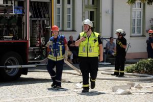 entgegenzutreten entschieden sich zurück im Feuerwehrhaus alle für eine große Wasserschlacht. Der Vorplatz des Gerätehauses wurde zum Schauplatz des Spektakels – mit allem, was dazu gehört. Selbst vom Kommandanten wurde dabei nicht halt gemacht. Nach einer Mittagsstärkung war dann die Abschlussübung am Kulturzentrum dran, an die sich das Abschlussessen mit Schnitzel, Spätzle und Soß’ anschloss.