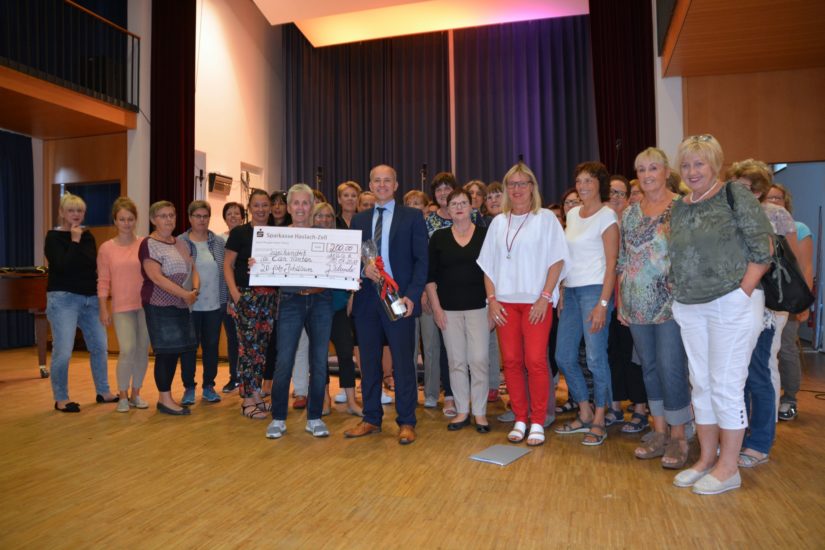Regionalleiter Jürgen Schmider von der Sparkasse Haslach-Zell überraschte die CanTanten bei der Generalprobe mit einem 200-Euro-Scheck und einer Magnum-Flasche Sekt. Die Damen haben sich über den Besuch sichtlich gefreut. Von dem überaus gelungenen Benefizkonzert konnte er sich am Donnerstagabend persönlich überzeugen, da er, wie zahlreiche andere Gäste auch, daran teilnahm.