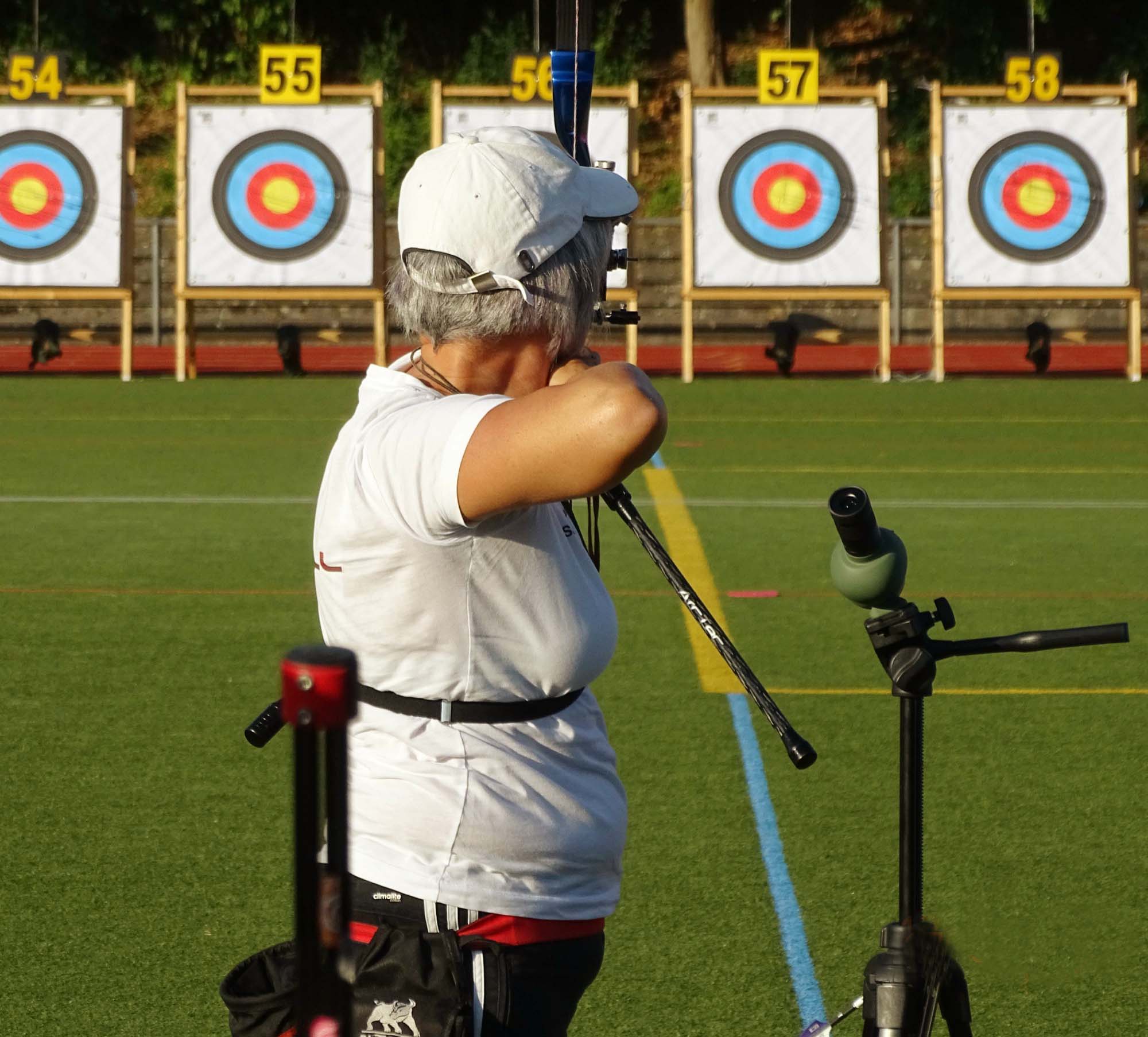 Auf dem Sportplatz des TUS Dotzheim waren 58 Scheiben auf verschiedene Distanzen aufgestellt. 232 Schützen, davon 31 Damen in der Masterklasse Recurve gingen am Freitagmorgen an den Start, um um ihren Meistertitel zu kämpfen. Bei sehr warmen Temperaturen und leichtem Wind begann der Wettkampf um 9 Uhr. Im Laufe des Vormittags nahmen die Windböen zu und die Luft heizte sich immer mehr auf. Doch der erste Durchgang lief für Sabine Herm gut und sie lag im vorderen Drittel auf Platz 9. Im zweiten Durchgang verstärkten sich die Windböen. Dies erschwerte es zunehmend eine gute Passe zu schießen. Zwar versuchten die Schützinnen die Böen abzuwarten. Das gelang aber nicht immer, denn für eine Passe mit sechs Pfeilen hatte man exakt vier Minuten Zeit. Am Ende lief es unter dem Strich ganz gut und Sabine Herm beendete ihre erste Deutsche Meisterschaft mit einem sehr guten 13. Platz mit 573 Ringen im vorderen Drittel.