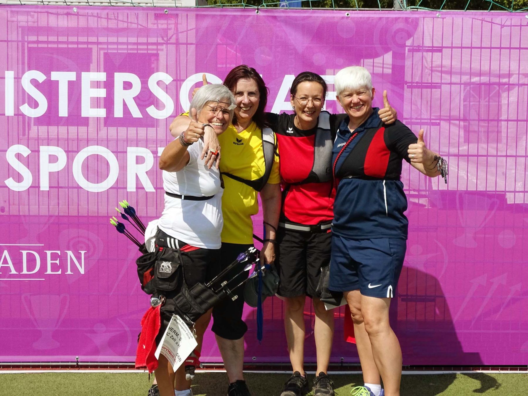 Sabine Herm (BSC Zell, 13. Platz), Birgit Gölz (BC Villingen-Schwenningen, 16. Platz), Babette Bartikowski (1. Berliner Bogenschützen, 3. Platz) und Margit Müller (Sportverein Jeersdorf, 18. Platz; von links nach rechts) schossen in Wiesbaden auf die gleiche Scheibe.