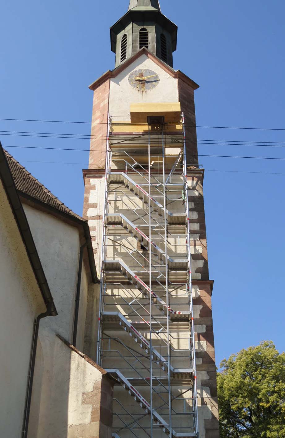 Die dringende Innenrenovierung läuft bereits seit drei Wochen. Die Firma Gottfried Lehmann Holzbau aus Unterharmersbach hat einige Zwischenböden und Treppen zum Turmaufgang komplett erneuert. Durch einen Wasserschaden und die ohnehin schon in die Jahre gekommenen Holzbalken war die Stabilität nicht mehr gewährleistet. Damit es zu keiner Gefährdung der Handwerker kommt, sind die Glocken abgeschaltet worden. Vier Stück hängen im Turm der Wallfahrtskirche nebeneinander und übereinander.