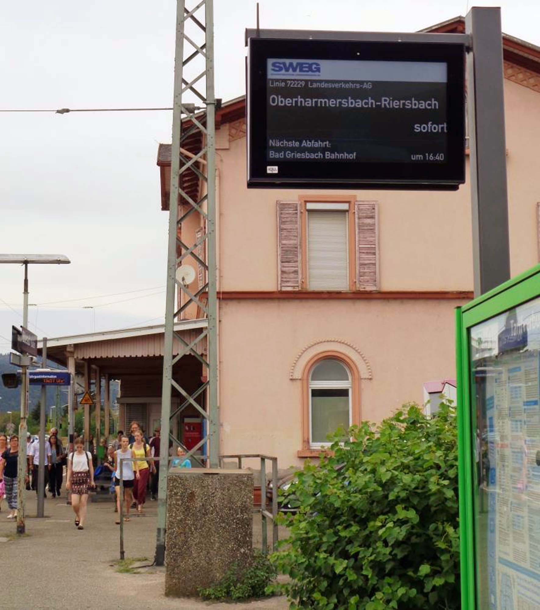 Die vor fünf Wochen neu errichteten digitalen Haltestellenanzeiger zeigen die jeweils nächste und die darauffolgende Verbindung in Echtzeit. Als Besonderheit in Biberach werden sämtliche SWEG-Verbindungen von dort, also auch die Züge in Richtung Hausach und Offenburg auf diese Weise aufgeführt.