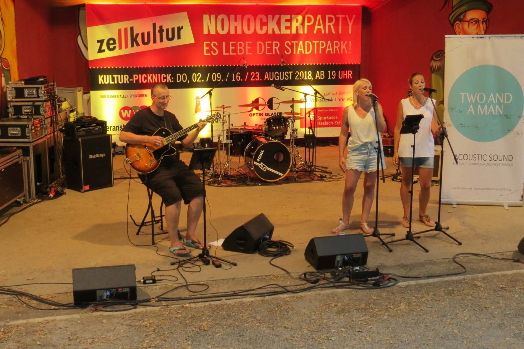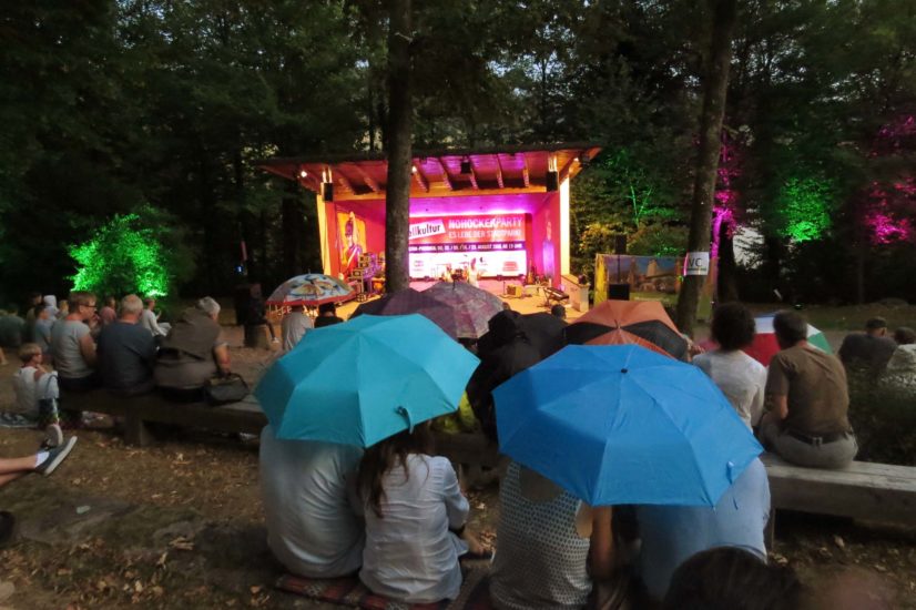 Zum finalen Nohocker-Abend kamen wieder ca. 300 Personen. Leider regnete es ab 21 Uhr in unregelmäßigen Abständen. Die meisten Besucher blieben trotzdem – unter Bäumen und unter Schirmen blieb man im Trockenen.
