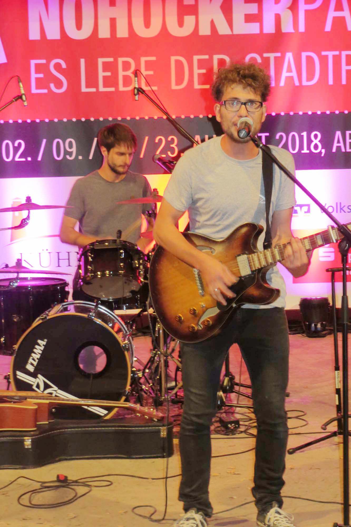 Den zweiten Musikpart übernahmen Niklas Bohnert und seine Band, die ihr Repertoire in deutscher Sprache sangen. Zwei E-Gitarren und der Schlagzeuger legten eine lautstarke Performance hin. Mit ausdrucksstarker Stimme sang Niklas Bohnert von der Liebe, Beziehungen und mehrmals vom »nicht aufgeben«. Diese Texte passten zum Publikum, das trotz einsetzenden Regens dablieb, seine Schirme hervorholte oder das Nass von oben einfach aushielt. Leider wurde der Regen ab 21 Uhr stärker und etliche Besucher traten den Heimweg an. «Wir sind keine gute Laune Band«, sagte Niklas Bohnert den Zuhörern, dazu sind seine Texte zu ernst und regen zum Nachdenken an. Niklas Bohnert gefiel den Zuschauern durch seine deutliche Aussprache der Liedtexte und seine Moderation der Lieder. Die drei Musiker spielten bis 21.30 Uhr.