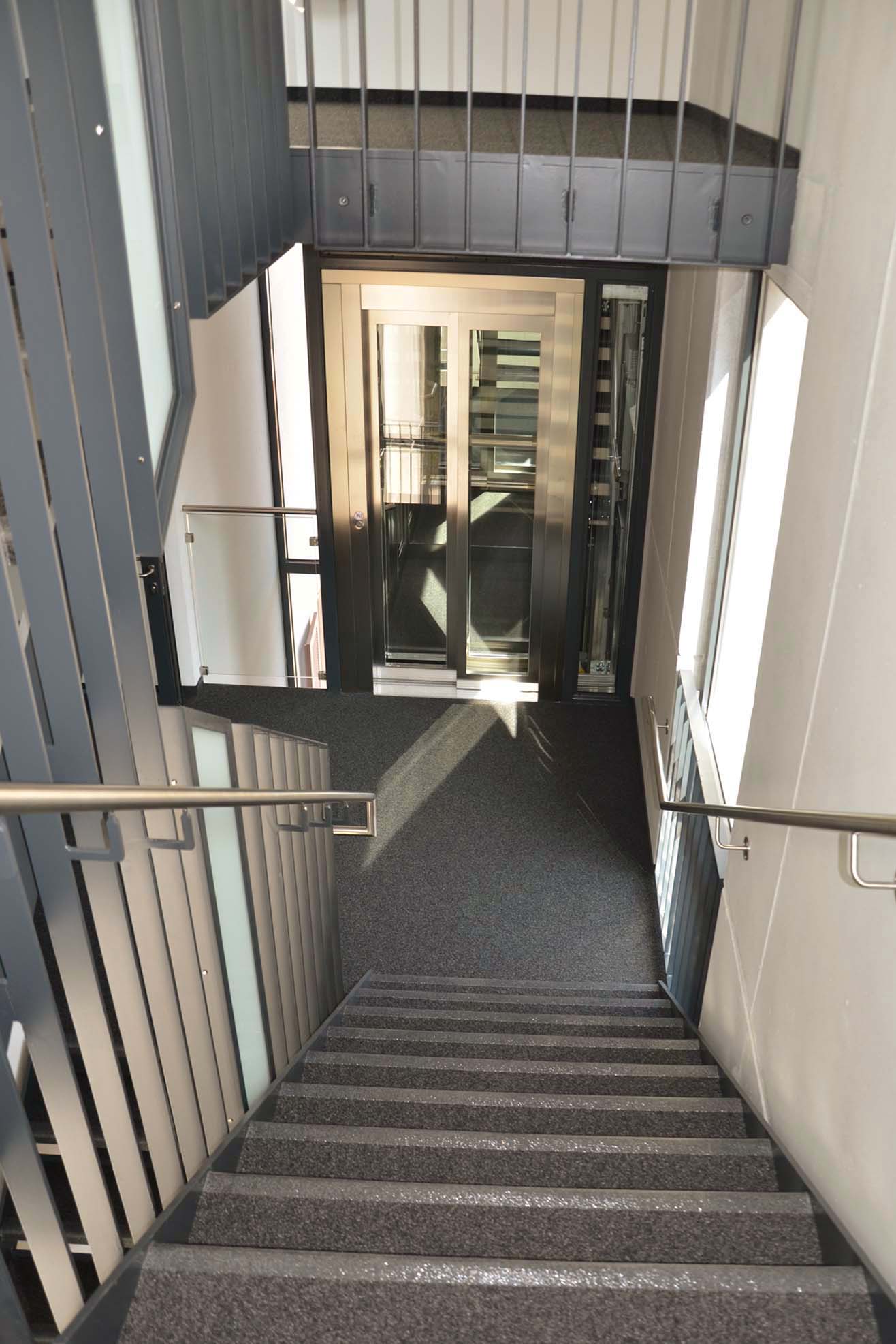 Der größte Eingriff in das bestehende Gebäude war der Abriss des alten und der Anbau eines neuen Treppenhauses mit einem Aufzug. Der werde sehr gut angenommen, so Bürgermeister Erhardt. In den ersten Wochen seit dem Einzug seien schon 2500 Fahrten registriert worden. Insgesamt ist das Verwaltungsgebäude nun barrierefrei.