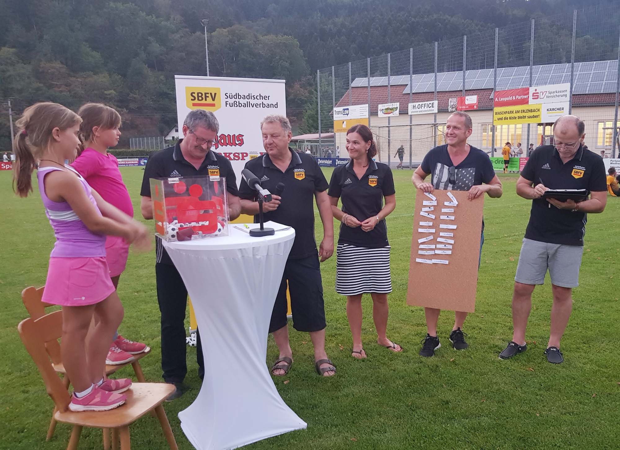 Unterstützt wurden die Verantwortlichen von Sofie und Malia Damm, beide 8 Jahre alt, und Spielerinnen der F-Junioren beim ZFV. Der Dank der Verantwortlichen galt gleichzeitig Mathias Grabsch, als Vertreter der Rothaus-Brauerei, sowie Klaus Dold vom Sport-Portal Angriff-Online für ihr Kommen an diesem Abend. Es war eine tolle Auslosung, vor würdiger Kulisse!