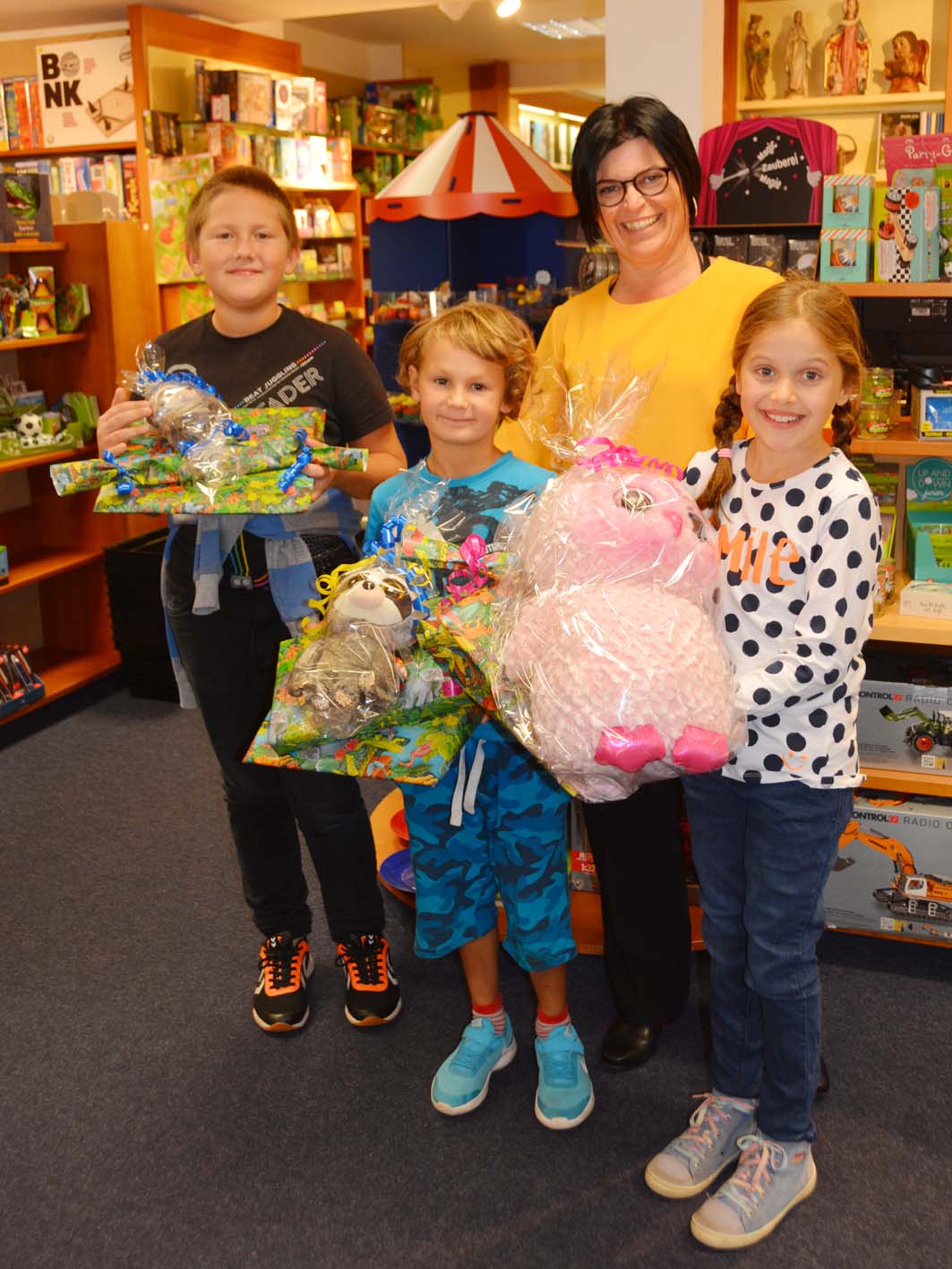 In diesem Jahr galt es zu zählen, wie viele Kulleraugen der beliebten Glubschi-Plüschtiere es im Schaufenster des Fachgeschäfts bei der Wallfahrtskirche zu entdecken gibt. 196 waren es insgesamt. Fünf Kinder lagen mit 194 bzw. 198 ganz nah dran, so dass letztlich das Los entscheiden musste. Inhaberin Petra Kühnpast konnte nun den glücklichen Gewinnern die schönen Preise – natürlich Glubschi-Tiere – überreichen. Über den 1. Preis freute sich Hanna Braun aus Biberach (rechts). Der 2. Preis ging ebenfalls nach Biberach an Lion Steurer (Mitte) und der 3. Preis an Sascha Schweiger (links) aus Zell a. H.