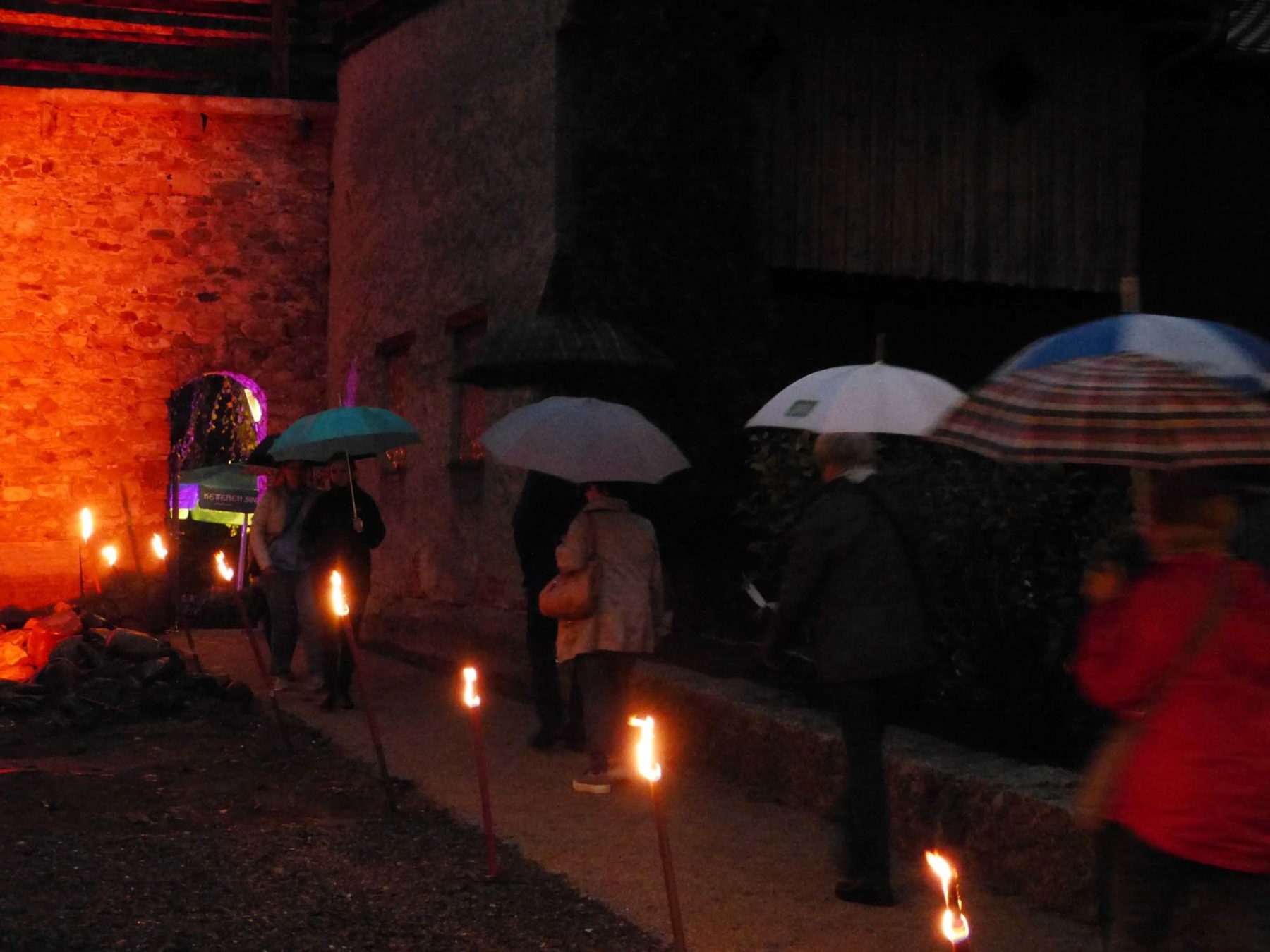 Eine ganz besondere Atmosphäre auch herrschte beim neu sanierten Haus Nummer 3 in der Hinteren Kirchgasse. Dort hatte die Stadt einen von Fackeln beleuchteten Fußweg eingerichtet, der beim Bräukeller durch die in Lila und Rot angestrahlte Stadtmauer hindurchführte.