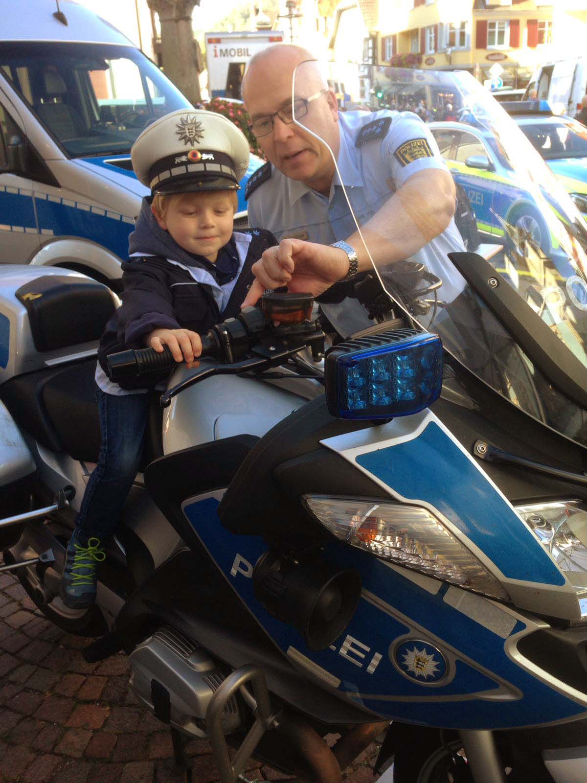 Die Beamten vom Polizeiposten Zell nutzten den Tag, um mit vielfältigen Mitmach-Angeboten Kindern die Angst vor den Herren und Damen in blauer Uniform zu nehmen. Die Button-Maschine war ständig im Einsatz, es wurden Hunderte Bilder gemalt. Highlight war aber ein ganz besonderes Fotomotiv: Die Kids konnten sich in originalgetreue, extra in Kindergrößen angefertigte Uniformen werfen, damit die Eltern ein Erinnerungsfoto von ihnen – auf einem Original-Einsatzmotorrad sitzend – schießen konnten.