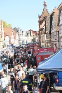 Besucher, die aus Richtung Biberach oder Nordrach zum Aktionstag kamen, wurden von dem Plätschern eines eigens aufgebauten THW-Brunnens begrüßt. Im Weiteren boten die Katastrophenschützer ab dem Kreisverkehr stadteinwärts eine große Fahrzeugschau. Riesiges Spezialgerät konnte erklommen werden. Das »MzAF« der Ortsgruppe Germersheim, ein Amphibienfahrzeug, kann zum Beispiel Material bis zu einem Gewicht von vier Tonnen transportieren (zum Beispiel Sandsäcke oder 20 Personen), schwimmt ab einer Wassertiefe von 1,2 Meter und schaltet bei Grundberührung automatisch wieder auf »Radantrieb« um. Vom »Aussichtsdeck« konnten die Besucher einen tollen Überblick über das quirlige Treiben in der Hauptstraße gewinnen. Gleich daneben staunte man nicht schlecht über einen Radlader, der im Katastrophenfall Schutt und Trümmern durch seine erheblichen Dimensionen gewachsen ist. Das Fahrzeug wiegt 13 Tonnen, die Schaufel fasst unglaubliche 1,8 Kubikmeter und ist das in letzter Zeit viel zitierte »Lieblingsspielzeug« von Biberachs neuem THW-Ortsbeauftragen Hans-Jörg Sorychta.