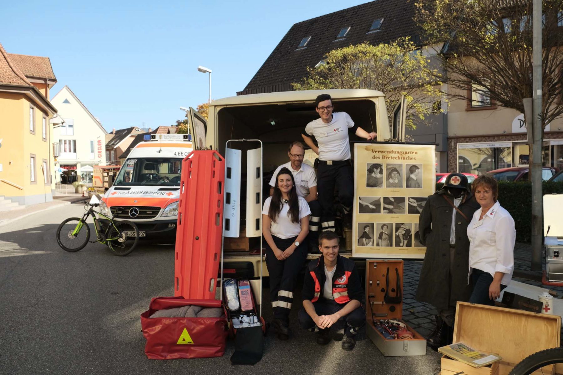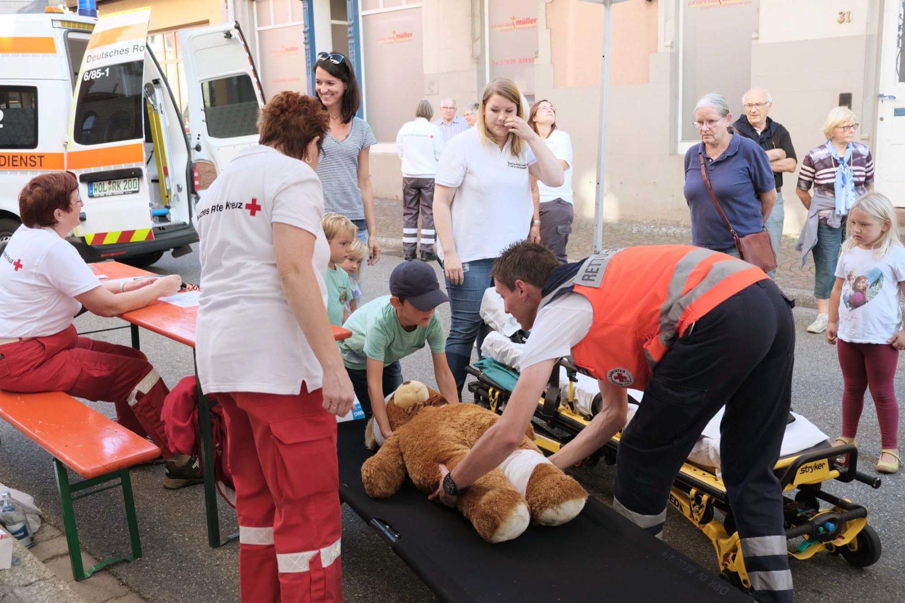 Gleich nach der Präsentation des ULF war auf der Aktionsfläche vor dem Rathaus das Rote Kreuz mit dem Ortsverein Zell am Harmersbach dran. Die Helfer zeigten unter gleichermaßen sympathischer wie kompetenter Moderation von Dr. Anna Niederberger in einer schauspielerischen Einlage alles, was man wissen muss, wenn man auf eine bewusstlose Person trifft. Wichtigste Botschaft: Man kann nichts falsch machen außer nichts zu machen.
