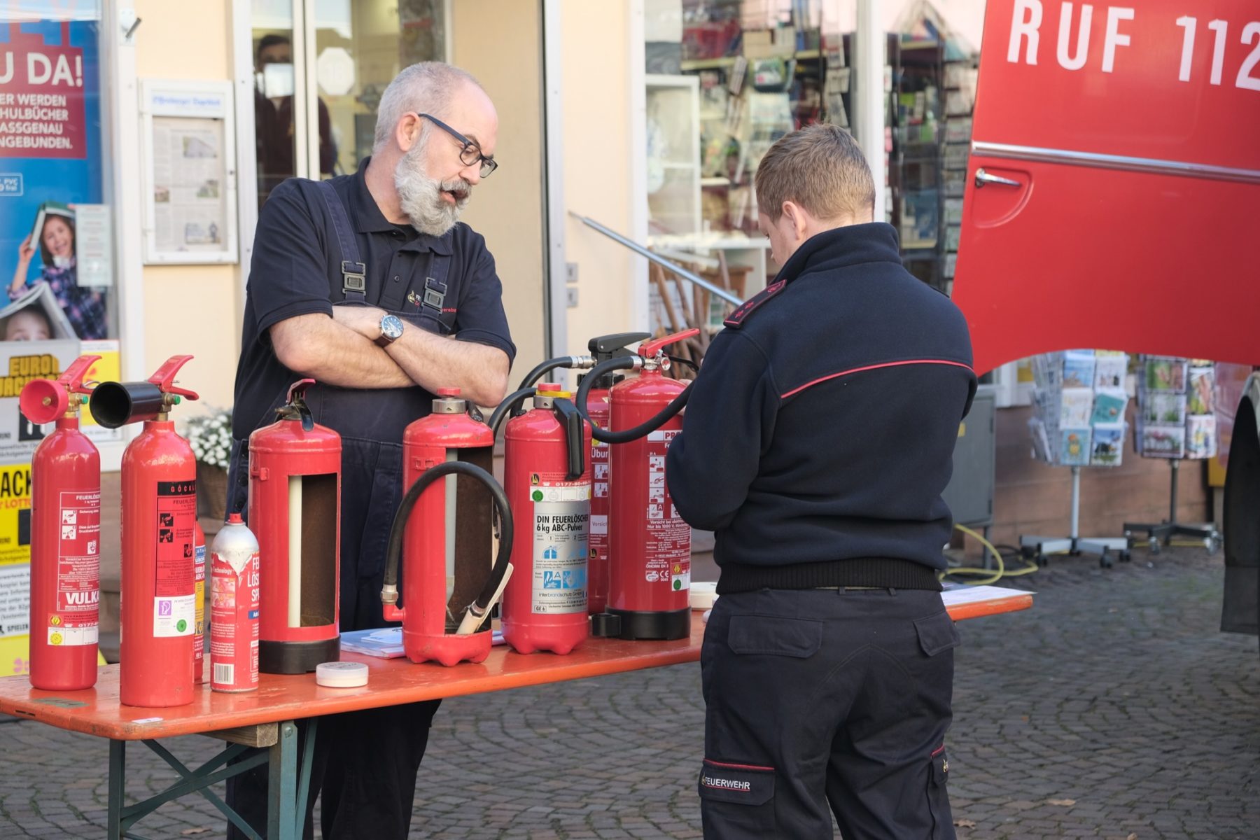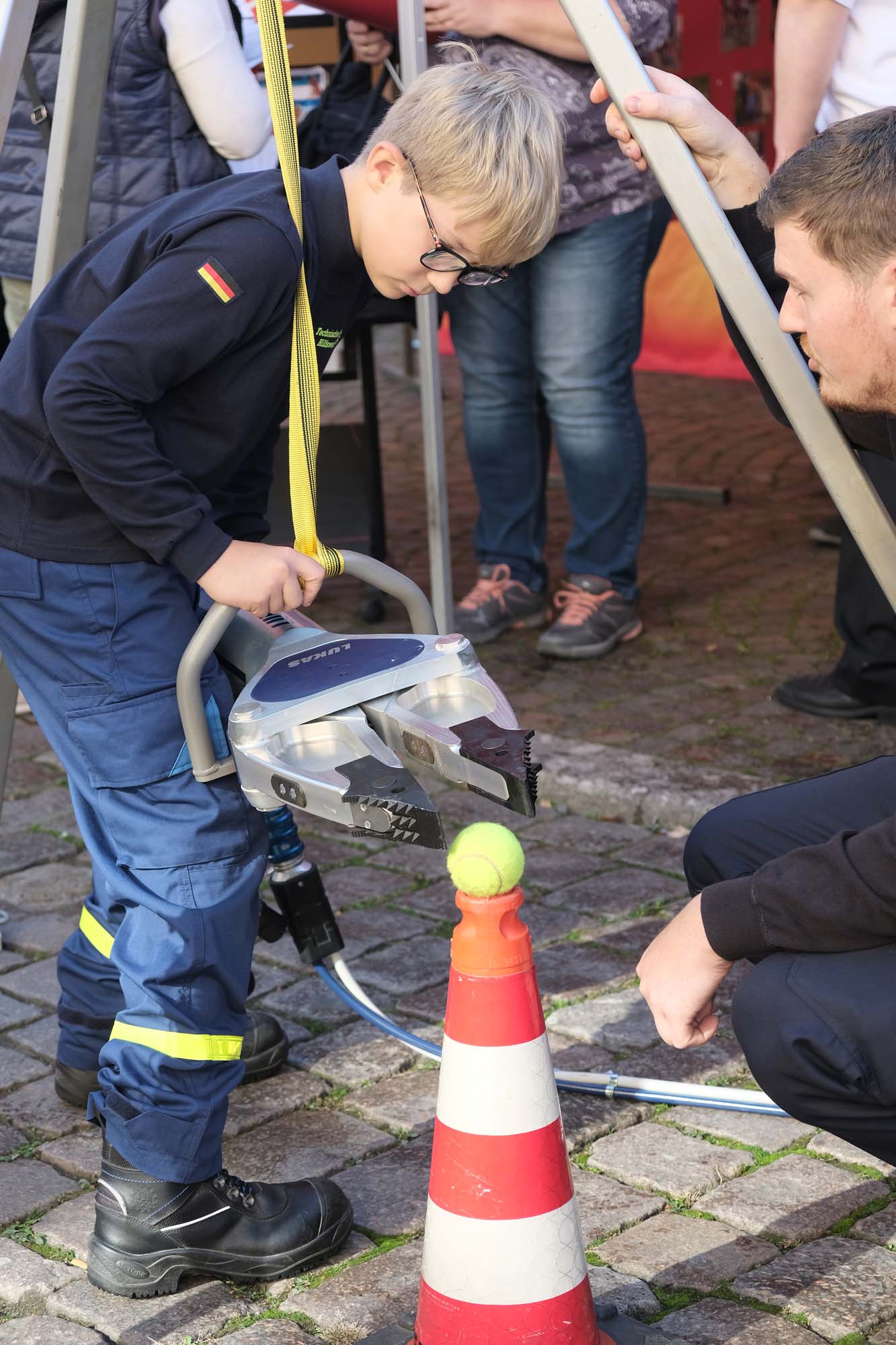 Doch nicht nur die Brandbekämpfung gehört zum Aufgabenspektrum der Feuerwehr. Wie es sich anfühlt, Karosserieteile mit Spezialgerät aus einem Unfallfahrzeug herauszuschneiden, konnte jeder Besucher selbst ausprobieren. Geschicklichkeit war gefragt, um mit einem hydraulischen Greifer einen Tennisball von einer Pylone auf die andere zu buxieren. Ein großer Spaß, vor allem für die Kinder. Außerdem hatten die Kameraden einen Infostand dabei, bei dem man sich über die verschiedenen Arten von Handfeuerlöschern informieren konnte und natürlich auch jede Menge Fahrzeuge und Ausrüstung, zum Teil von Kollegen aus Offenburg und Lahr, vom Hochwasserschutz bis hin zum Riesenventilator.