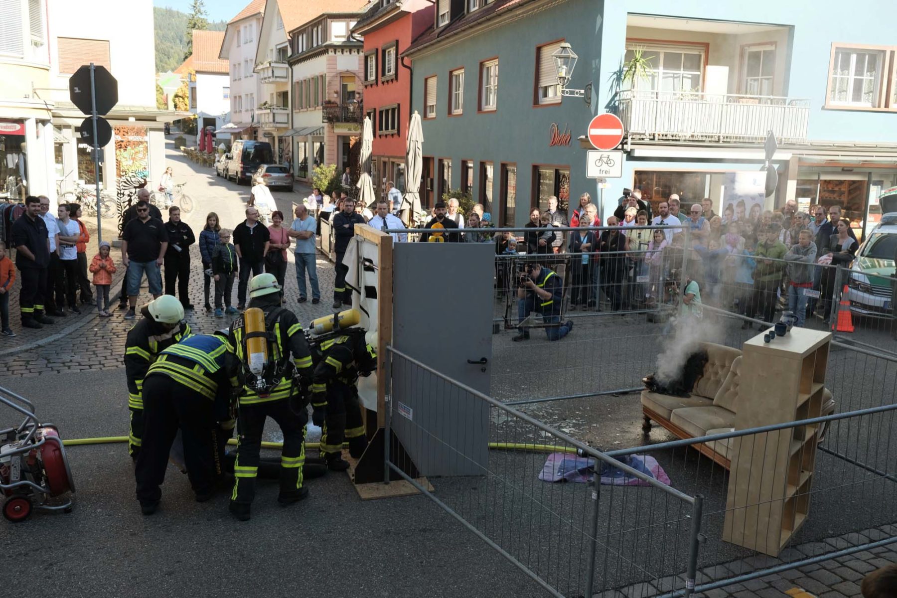 Die Feuerwehren Zell, Biberach, Nordrach und Oberharmersbach zeigten zusammen eine Schauübung zum Thema Zimmerbrand. »Es brennt, es brennt!«, rief der Wohnungseigentümer und alarmierte die Feuerwehr. Die war auch kurz darauf mit einem Löschfahrzeug vor Ort und unternahm alle nötigen Schritte, um das Feuer so schnell wie möglich zu löschen. Die Wasserversorgung wurde aufgebaut, das Fenster eingeschlagen, für gute Sicht gesorgt und dann dem Brand mit Wasser der Garaus gemacht. »Türen in der Wohnung geschlossen zu halten ist sehr wichtig«, mahnte der Zeller Kommandant Florian Lehmann an. Insbesondere der Rauch breitet sich bei geschlossenen Türen nicht in der ganzen Wohnung aus. Nachmittags kam dann noch die Jugendfeuerwehr zum Einsatz. Ihr Löschangriff auf eine Holzhütte sorgte für dichten Qualm rund ums Rathaus, der sich nach einigen Minuten und dem Eingreifen der »Großen« jedoch wieder verzog.
