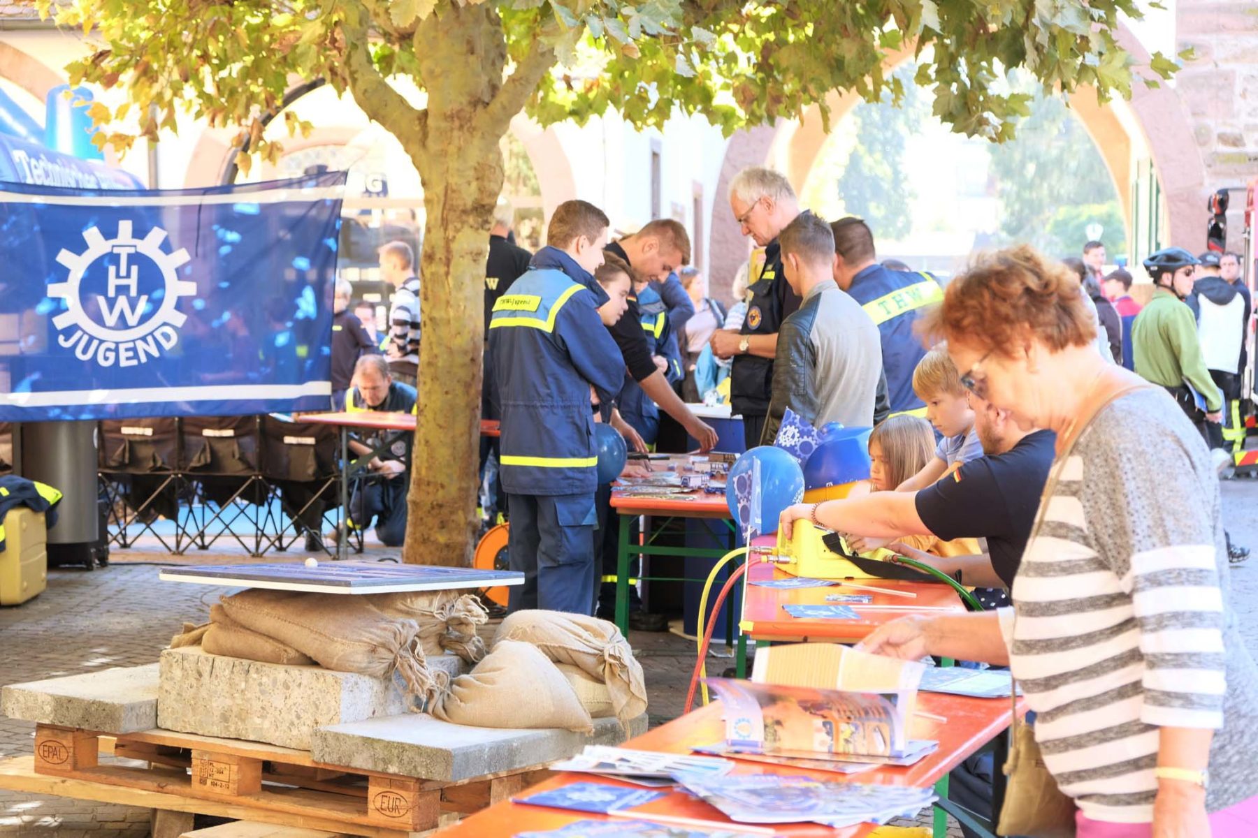 An einem anderen Infostand konnte man sich über Aufgaben und Engagement im THW informieren. Gut besucht war stets zudem die Auskunftsstelle, die Fragen rund um das THW-«ULF« (Unbemanntes LuftFahrtsystem) beantwortete. Die Drohne des THW Ortsverbands Breisach konnte früh am Morgen und am Nachmittag in Aktion vor dem Rathaus mit Live-Übertragung der erzeugten Bilder auf einen großen Fernseher begutachtet werden. Zudem erhielten die Zuschauer gebündelt interessante Fakten rund um das ULF. Seit zwei Jahren hat das THW Drohnen im Einsatz und setzt sie meist zur Unterstützung von Polizei und Feuerwehr ein. Die Einsatzlage beim Brand im Europapark diesen Sommer wurde unter anderem durch eine THW-Drohne überwacht. Der große Vorteil gegenüber einem Hubschrauber: Das ULF kann niedriger fliegen als ein Helikopter, was für bessere Sicht sorgt. Zudem liegen die Kosten pro Betriebsstunde um den Faktor 100 niedriger: 10.000 Euro kostet eine Stunde Hubschrauberflug, nur 100 Euro eine Stunde mit der Drohne.