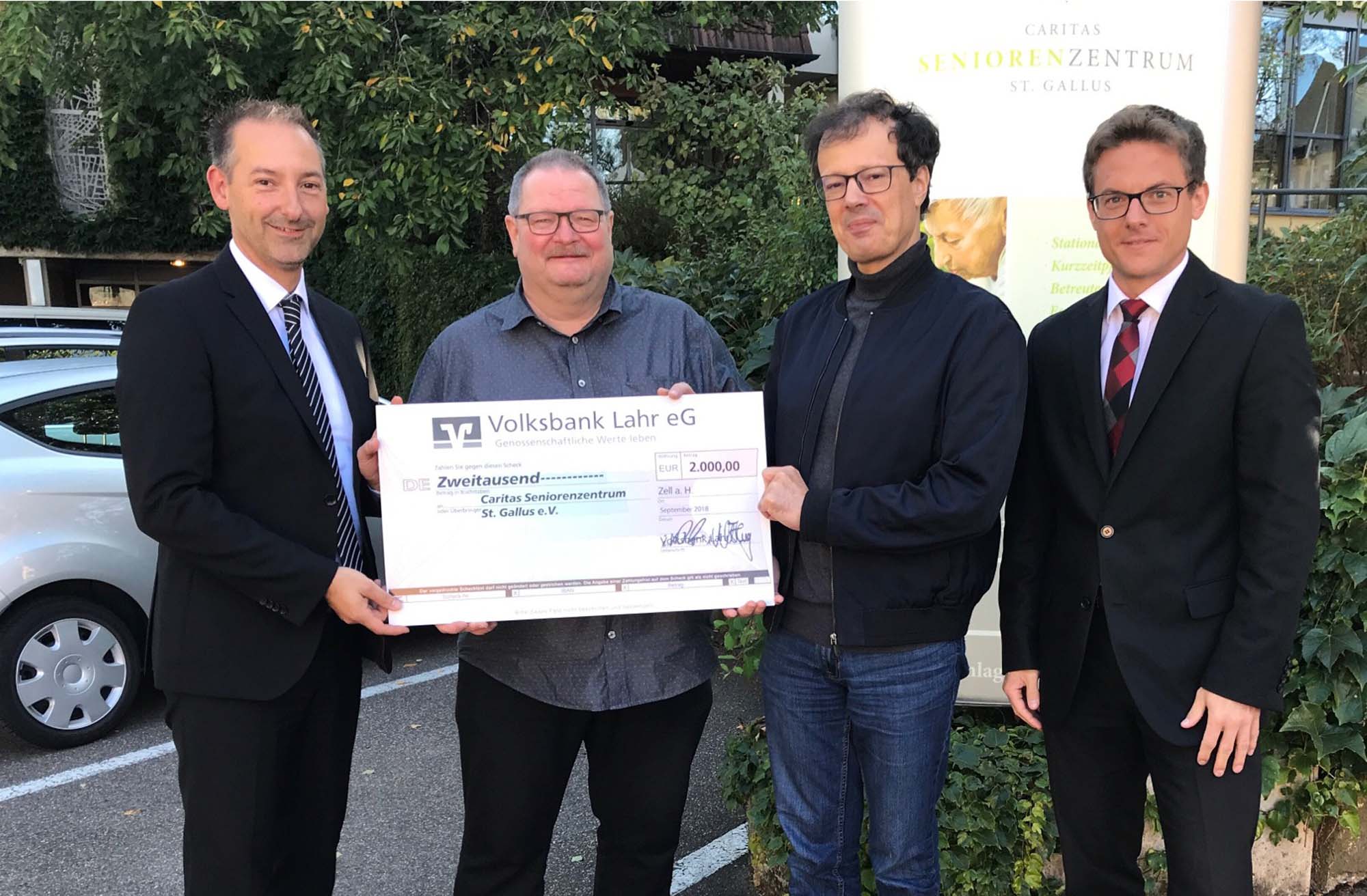 Anlässlich des 50-jährigen Jubiläums des Caritas Seniorenzentrum St. Gallus e. V. übergab die Volksbank Lahr eine Spende über 2.000 Euro.