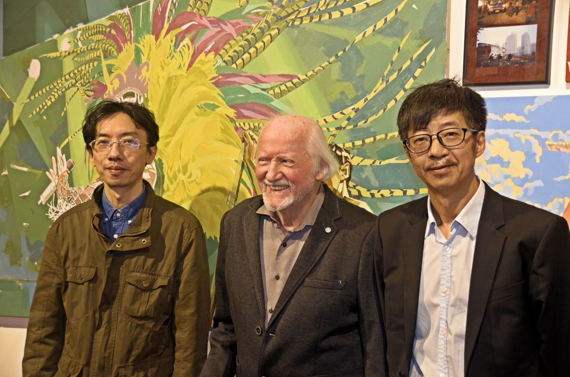 Galerist und Kunstsammler Walter Bischoff (Mitte) mit dem ausstellenden Künstler Zhang Bin (links) und He Jinwei (rechts), der die gegenwärtige Ausstellung zwischen ASAS Peking und ASAS Zell a. H. mitkoordinierte.