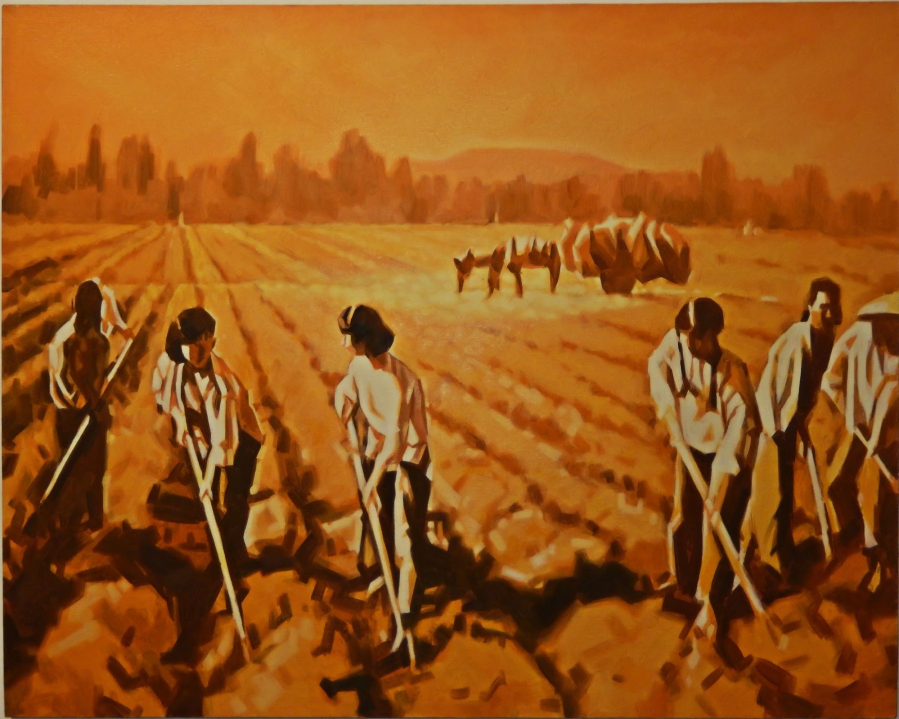 Durch die schrittweise Öffnung zum Westen seit den 1980er Jahren lockert sich die Strenge der politischen Malerei. So ist es Zhang Bin (*1966) dem Sohn von Zhang Yizhi, möglich, sich in volkstypischen, ländlichen Szenen auszudrücken. Zwar immer noch mit Spuren der Verherrlichung, aber mit dem spürbaren Widerspruch zwischen Ideal und Realität. Bei dem Werk »Dust« von 2006 werden Frauen bei der Feldarbeit dargestellt in staubigen Terrakotta Farbtönungen. Bei der »Romance on the Fishing Island” von 2018 zeigt der Künstler sozialistische Romantik und lässt, wie in zahlreichen neueren Arbeiten, amerikanische Pop-Art-Elemente einfließen. Mit wunderschön realistischen Blütenträumen (Azalee, Winterjasmin etc.) macht es der Künstler uns Westeuropäern leichter, Zugang zur chinesischen Kunst und ihren Themen zu finden.