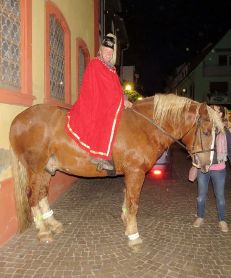 Foto: Gisela AlbrechtDie Feuerwehr und die Polizei sorgten für die Sicherheit beim Laternenumzug. Hubert Hansmann führte als Reiter mit seinem Pferd Dario den Laternenumzug an. Sein leuchtend roter Umhang war auch in der Dunkelheit gut zu sehen. Für das Feuer auf dem Kanzleiplatz war die Jugendfeuerwehr verantwortlich.