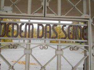 Dazwischen ein Tor, auf dem steht: »Jedem das Seine«. Der lateinische Spruch »suum cuique« sollte mahnen, mit dem, was man hat zufrieden zu sein und nicht nach dem Nachbarn zu schielen. »Begehre nicht, was dir nicht zusteht«, gedacht als Mahnung oder Gebot für einen Rechtsstaat.