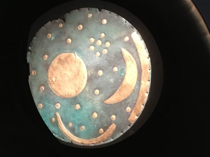 Archäologisch ist auch die Himmelsscheibe bekannt geworden. Sie zeigt die älteste Himmelsdarstellung. Die kupferne Scheibe ist 6.500 Jahre alt und zeigt Sonne Mond und das Siebengestirn, die Plejaden, bei Frühlingsbeginn. Sie ermöglichte die genaue Bestimmung von Saat und Ernte.«