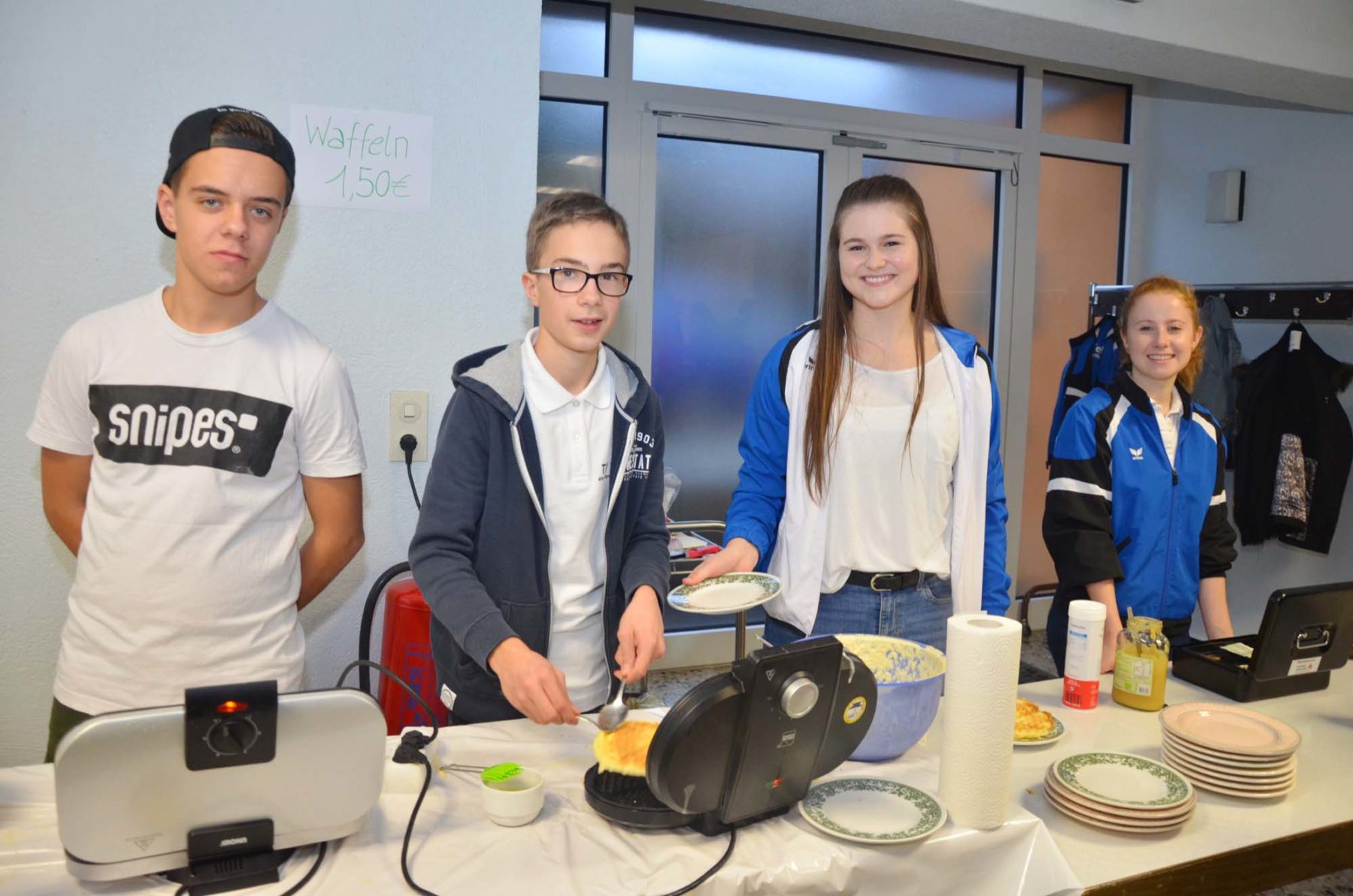 Die engagierte Jugendvertretung: Waffeln backen, bedienen, als Übungsleiter Auftritte vorbereiten und mit den Turnschülern aufführen. Sie sind alle echte Allrounder. Stellvertretend für das ganze zwölfköpfige Team sind hier (von links nach rechts) Silas Schätzle, Noah Wegner, Sabrina Schätzle und Jasmina Kopp beim Waffeln backen abgebildet.