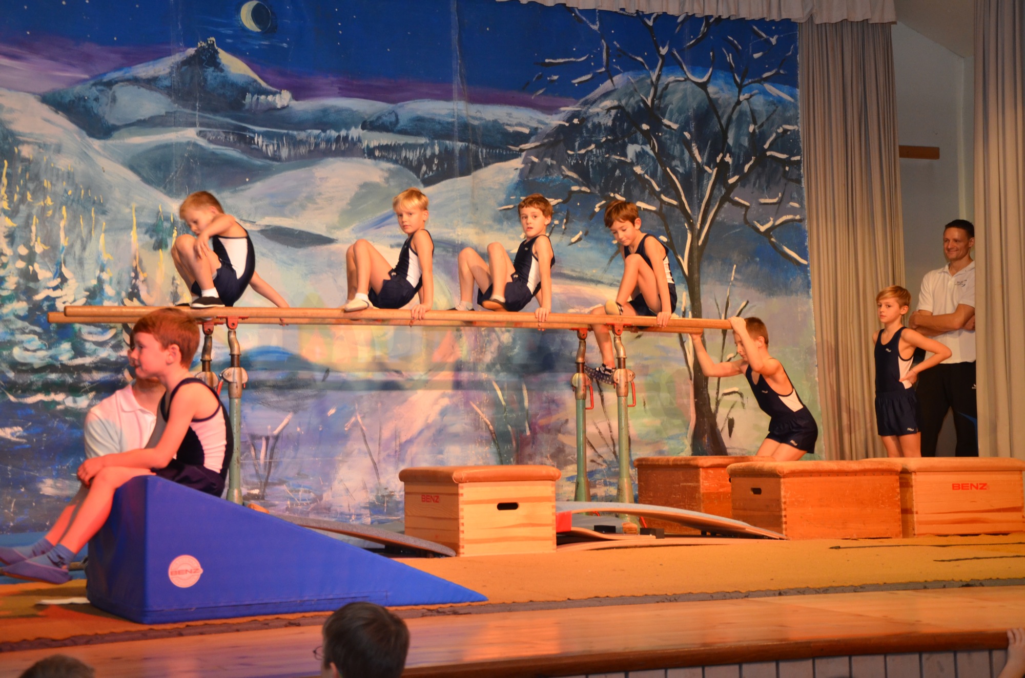 Turnerinnen und Turner aus den ersten Turnklassen zeigten am Boden Rolle vorwärts und rückwärts, Räder und manche eine Radwende. Ihr Repertoire an Sprüngen kennt die Klassiker Chassé, Streck-, Grätsch- und Pferdchensprung. Am zweiten Gerät, dem Turnkasten, zeigten die Mädchen Aufhocken mit verschiedenen Abgängen. Das zweite Gerät der Turnschüler war Barren. Daran demonstrierten die Jungen ihre Stützkraft. In verschiedenen Vierfüßlerläufen ging es über die Holme.