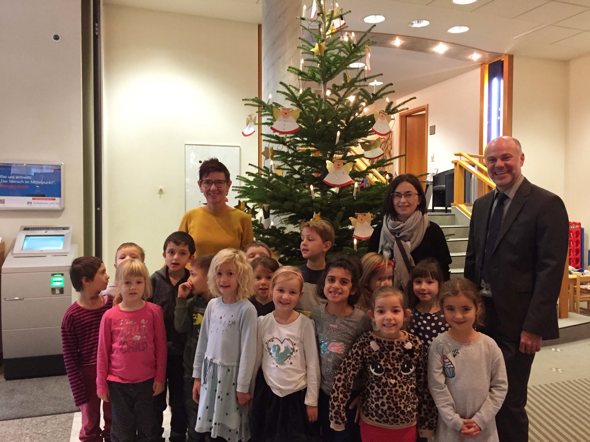 15 Schulanfänger vom Kindergarten Villa Regenbogen haben in der Volksbank-Filiale in Zell wieder beim Schmücken des großen Christbaums in der Schalterhalle geholfen.