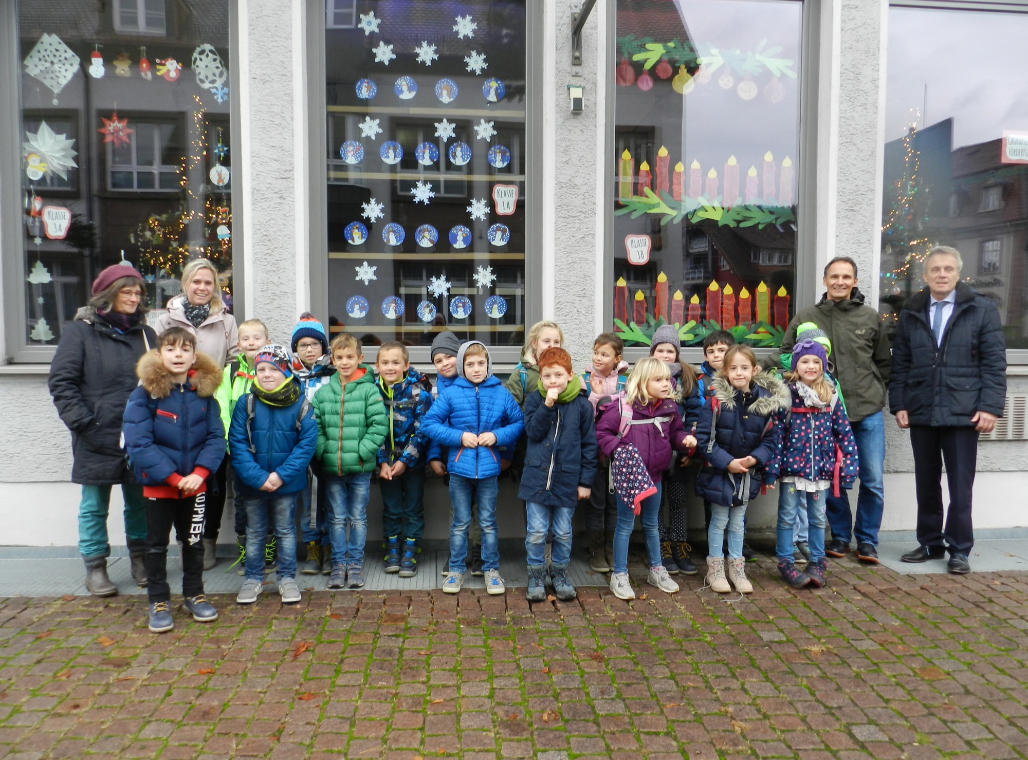 Am Freitagmittag gab es zur Einweihung einen kleinen Festakt. Konrektor Wolfgang Scharer und die Klassenlehrerin Frau Kühnhanss waren mit den Zweitklässlern gekommen, um die Fenster zu bestaunen. Katharina Künzel, selbst Lehrerin, lobte die Kinder »Ihr seid alle richtige Künstler, die Bilder sind wunderschön und alle haben daran ihre Freude.« Peter Scheid ergänzte: »Diese tolle Aktion von euch allen hat eine Belohnung verbindet. Für die sieben Klassenkassen gibt es je 50 Euro als kleines Weihnachtsgeschenk.« Konrektor Wolfgang Scharer dankte im Namen der Schule und der Eltern. Noch ein Winken der strahlenden Kinder und dann gings wieder zurück in die Schule.