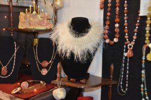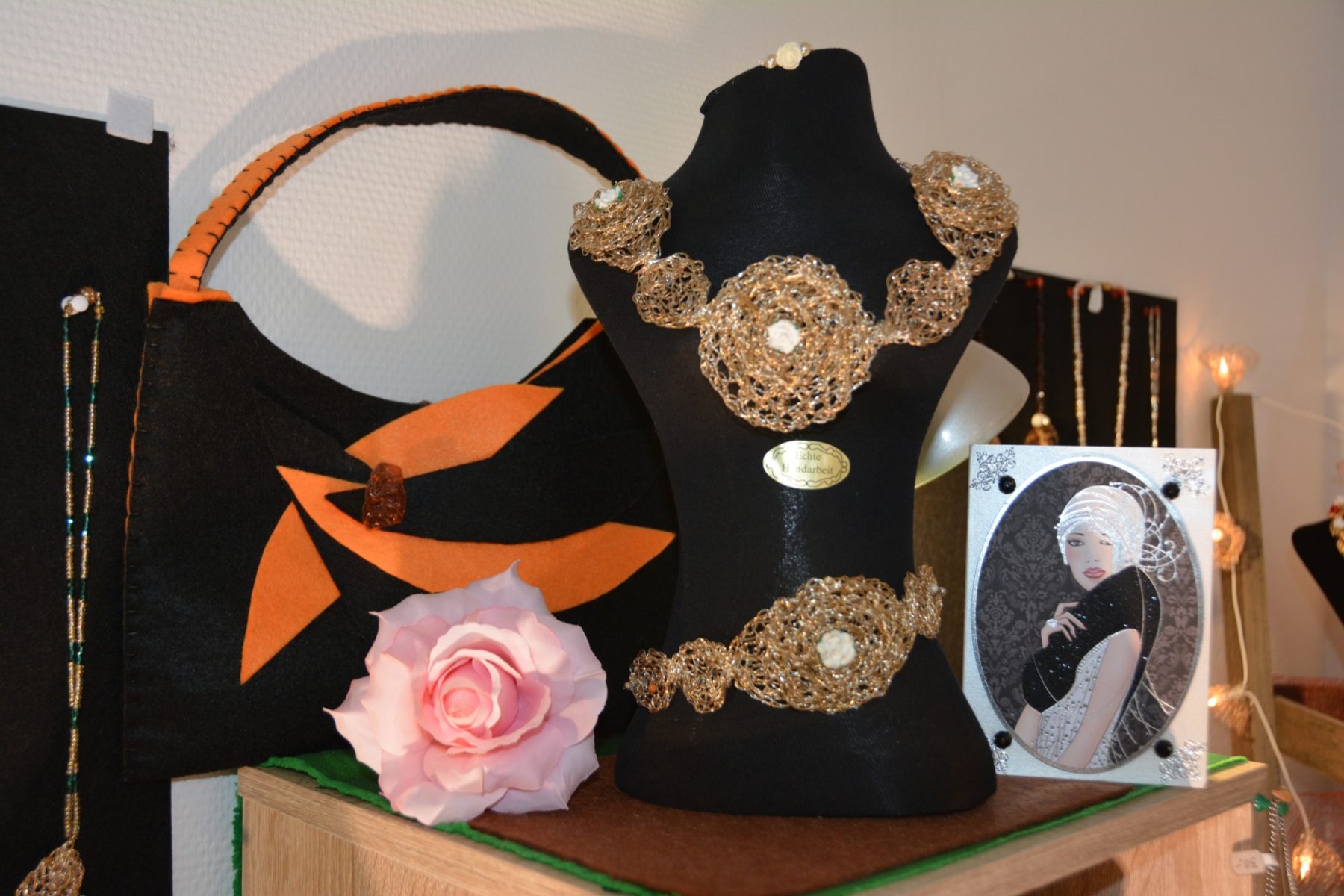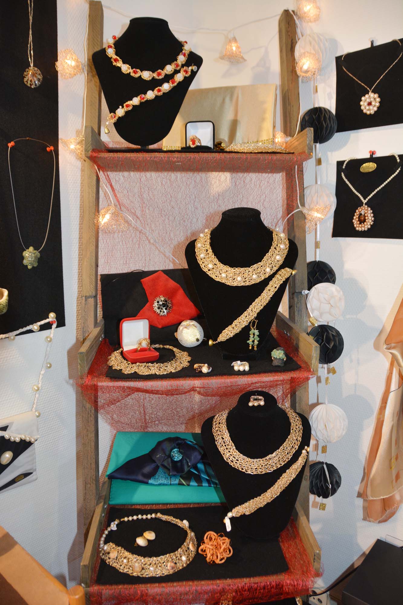 »Alles was Sie hier sehen ist selbst gefertigt«, versichert die versierte Kunsthandwerkerin. Ein Großteil der Schmuckstücke ist gehäkelt. Mit einer ganz normalen Häkelnadel, erklärt Elke Kövari. Die Colliers sind aufwändig verflochten, dezent sind leuchtende Swarovski-Steine oder matt schimmernde Perlen eingearbeitet. Sieben Stunden Arbeit benötigt sie für solch ein Schmuckstück, das es sonst in dieser Form nirgends zu kaufen gibt.