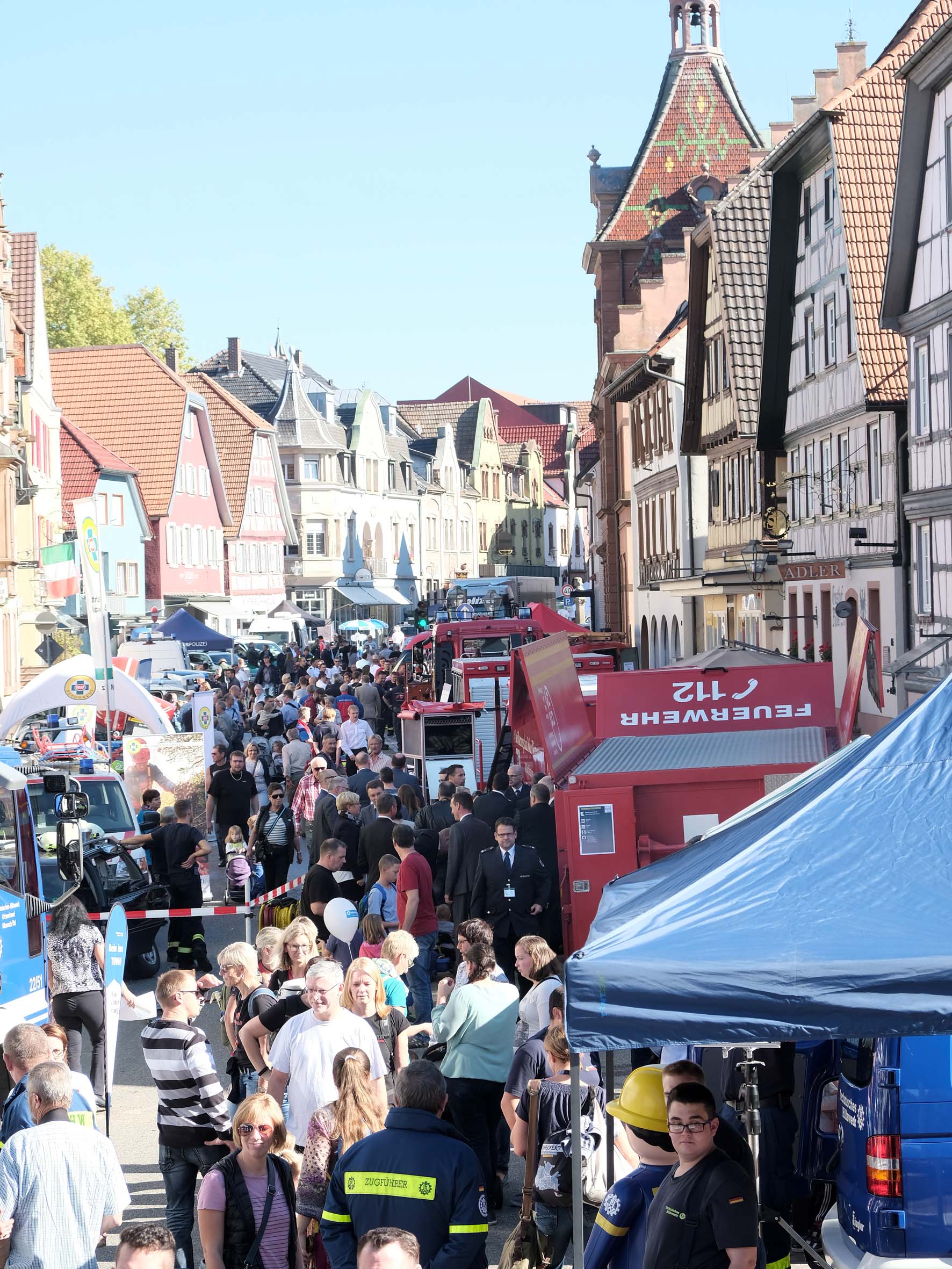 Innenminister Thomas Strobel besucht den »Tag der Sicherheit«. Fast 250 Einsatzkräfte der verschiedensten Blaulicht-Organisationen präsentieren entlang der Hauptstraße ihre Leistungen. Der Minister trägt sich in das Goldene Buch der Stadt ein. Zell a. H.